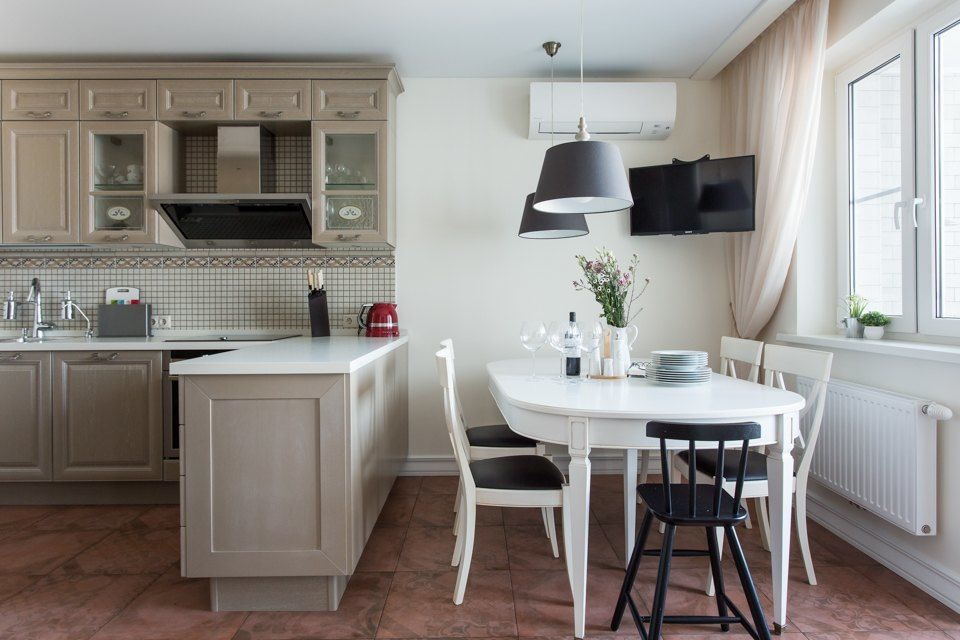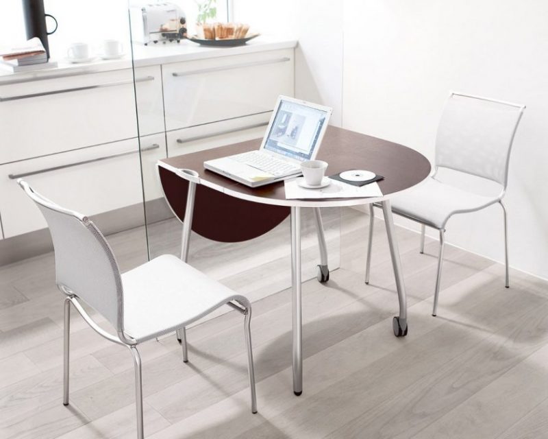 Em cozinhas com uma área modesta é difícil acomodar sem dobrar de móveis. É necessário selecionar um modelo que, quando montado, criará lugares confortáveis para 2-3 pessoas para uma refeição confortável.