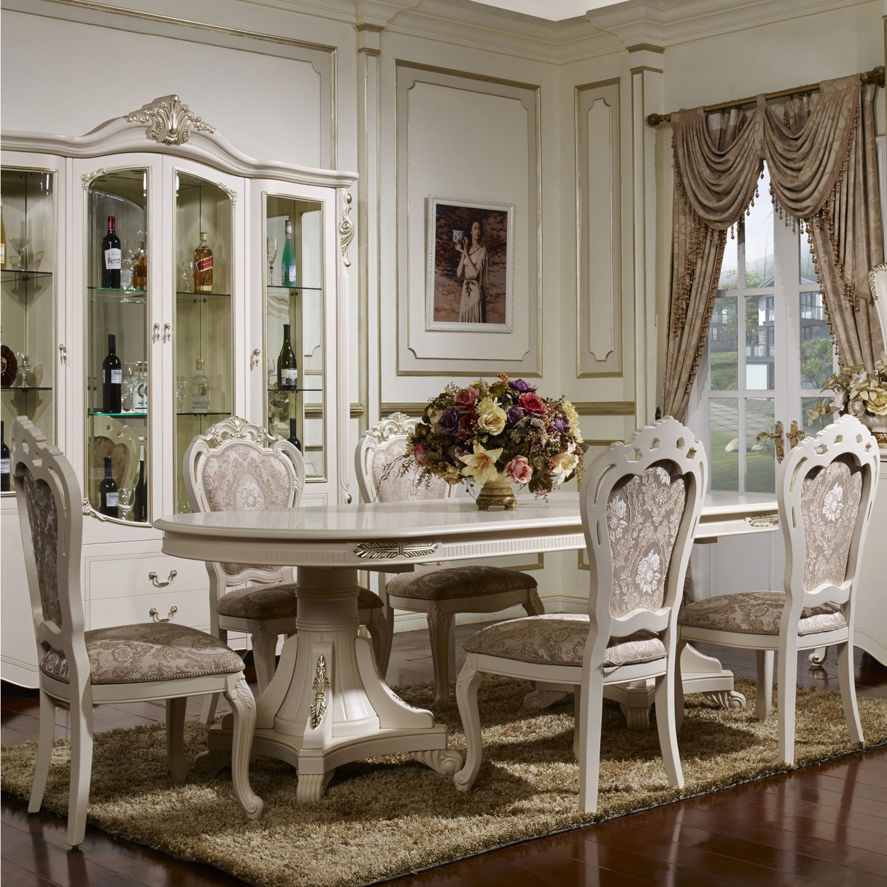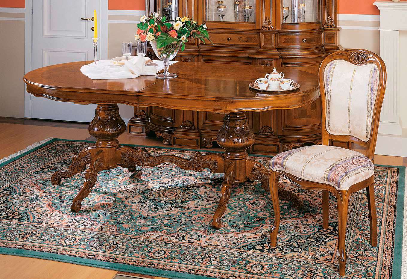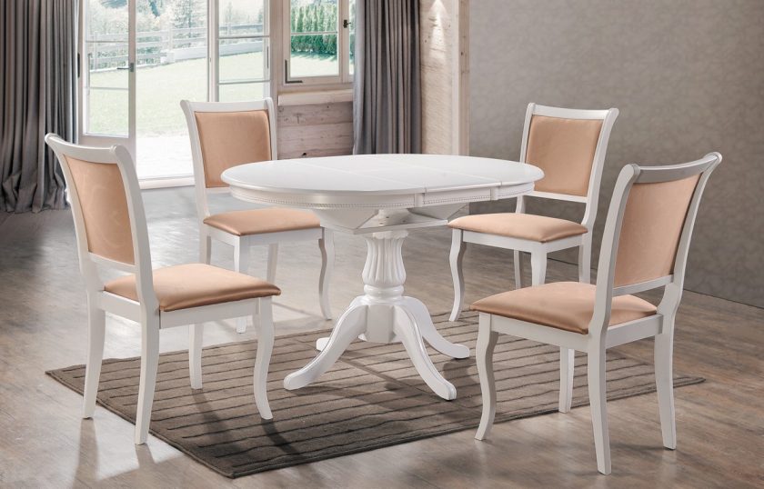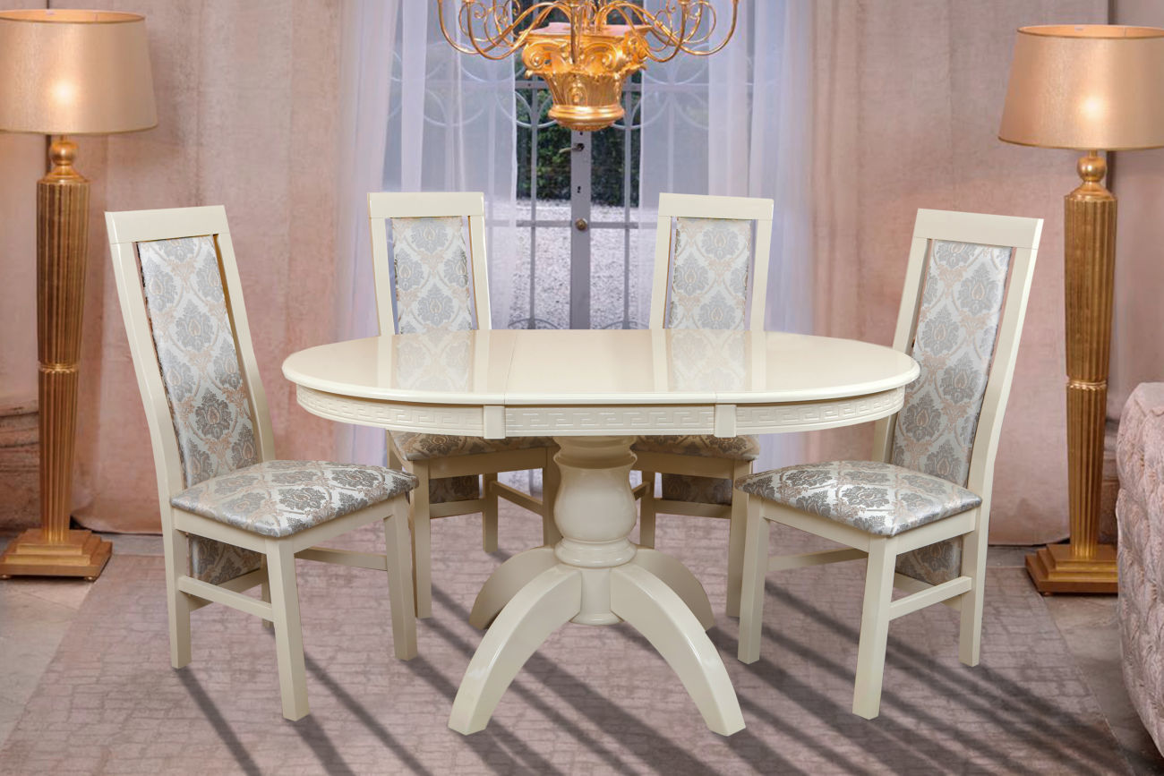 Moderação e elegância do estilo clássico nunca perderão relevância. Mobiliário sólido irradia bem-estar, estabilidade e luxo. Mesa oval feita de madeira natural, ricamente decorada com esculturas, elementos de ferro forjado cria uma atmosfera festiva. O conjunto de mesa e cadeiras parece incrivelmente harmonioso, proporcionalmente.