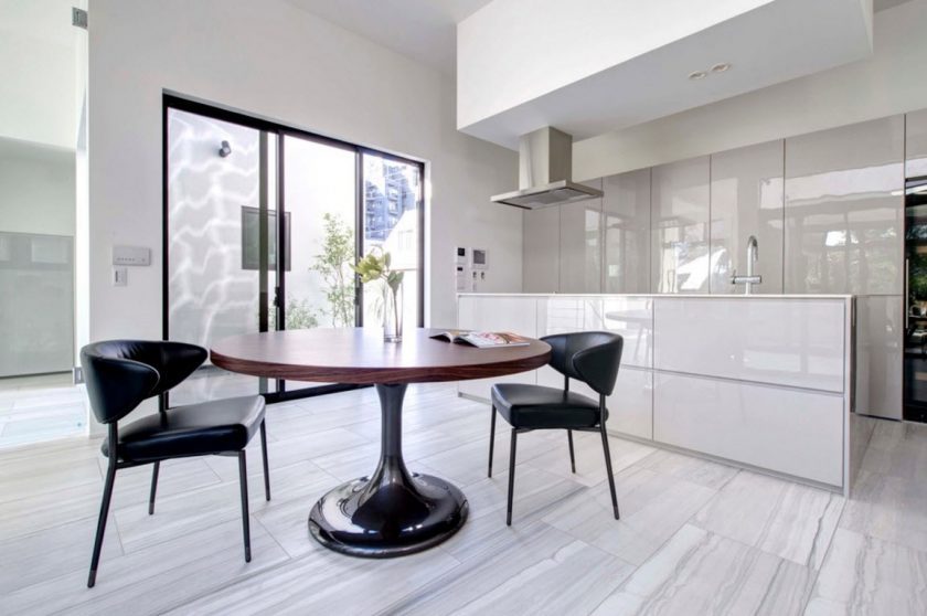 O estilo de pessoas ativas e energéticas que apreciam as conquistas da tecnologia, materiais artificiais e conforto. O princípio principal do interior não é nada supérfluo. Cores “frias”, peças de metal e vidro, linhas claras e móveis de formas geométricas regulares. O interior não implica a presença de madeira natural. Bancada oval de vidro ou metal com pés cromados - a melhor escolha para a cozinha. Cadeiras de plástico transparente encaixam-se elegantemente na área de jantar e visualmente dissolvidas no ar.