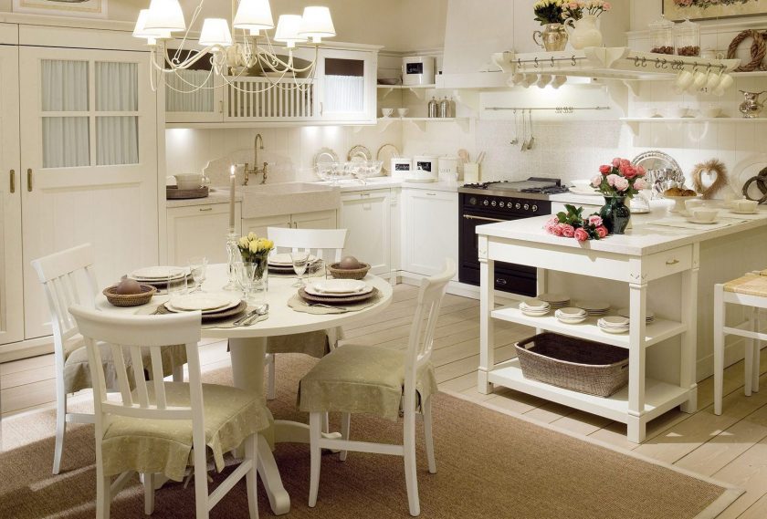 Conforto, facilidade, combinação harmoniosa de tons pastel no interior. O estilo provençal sempre se destacou pela suavidade do design e decoração delicada Requintados móveis de madeira pintada ou elementos de ferro forjado são detalhes importantes da cozinha em motivos rurais. O modelo de mesa oval tem um design simples e formas simples.