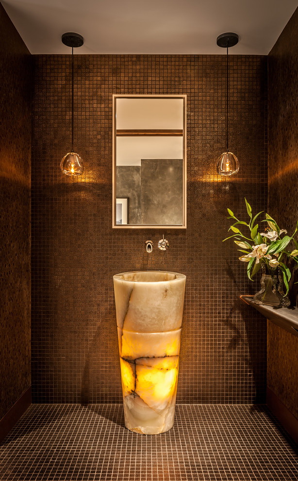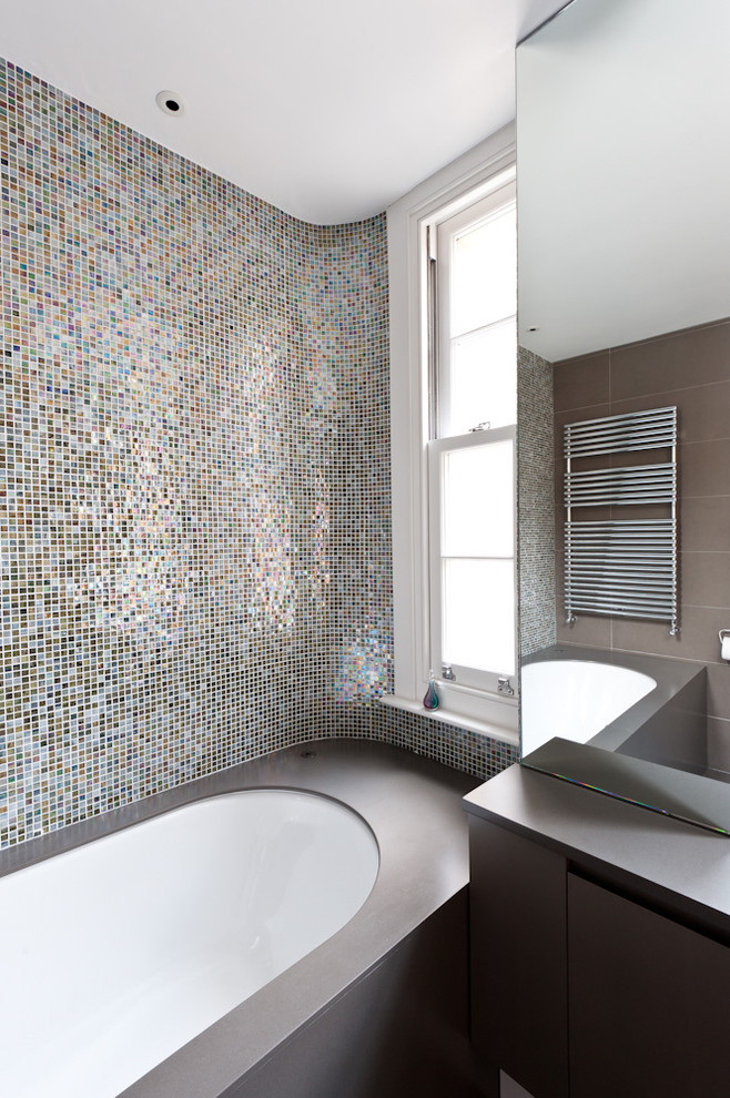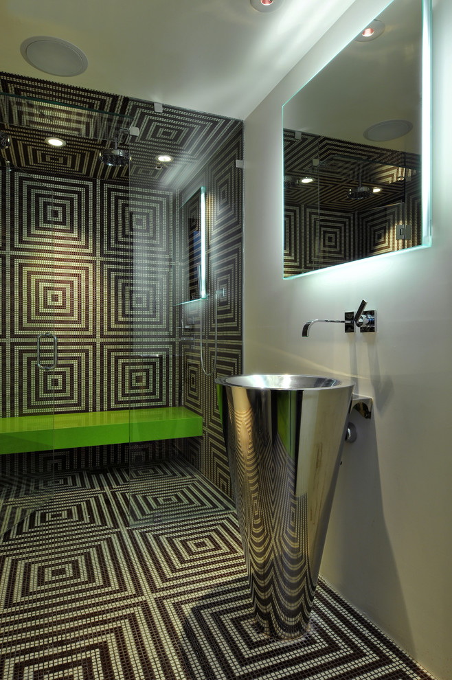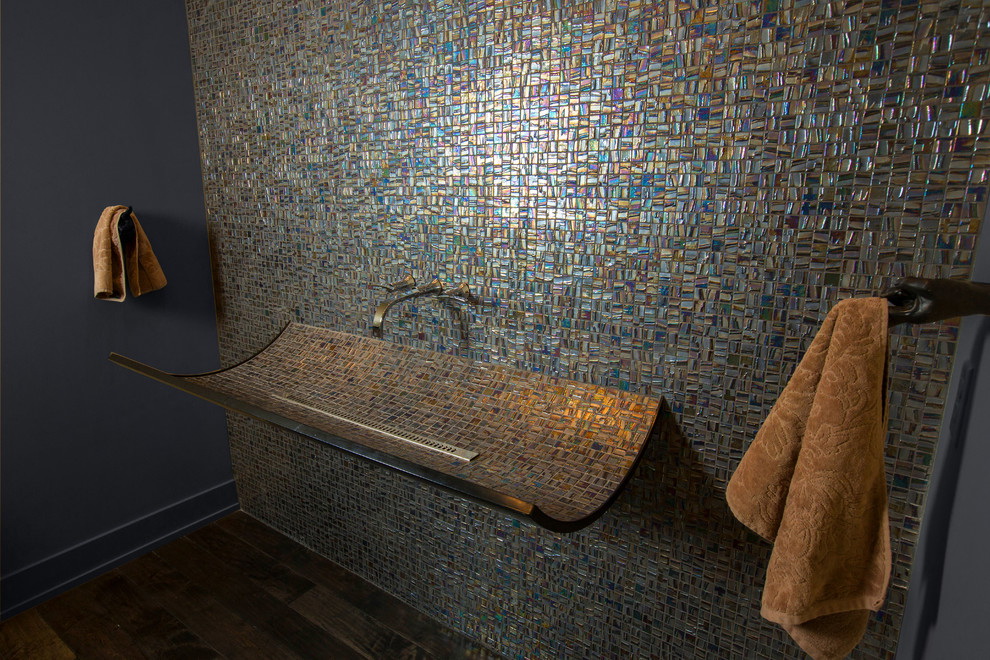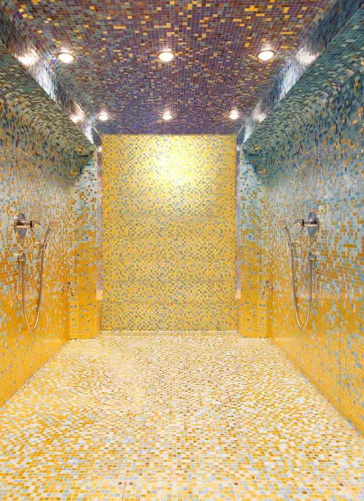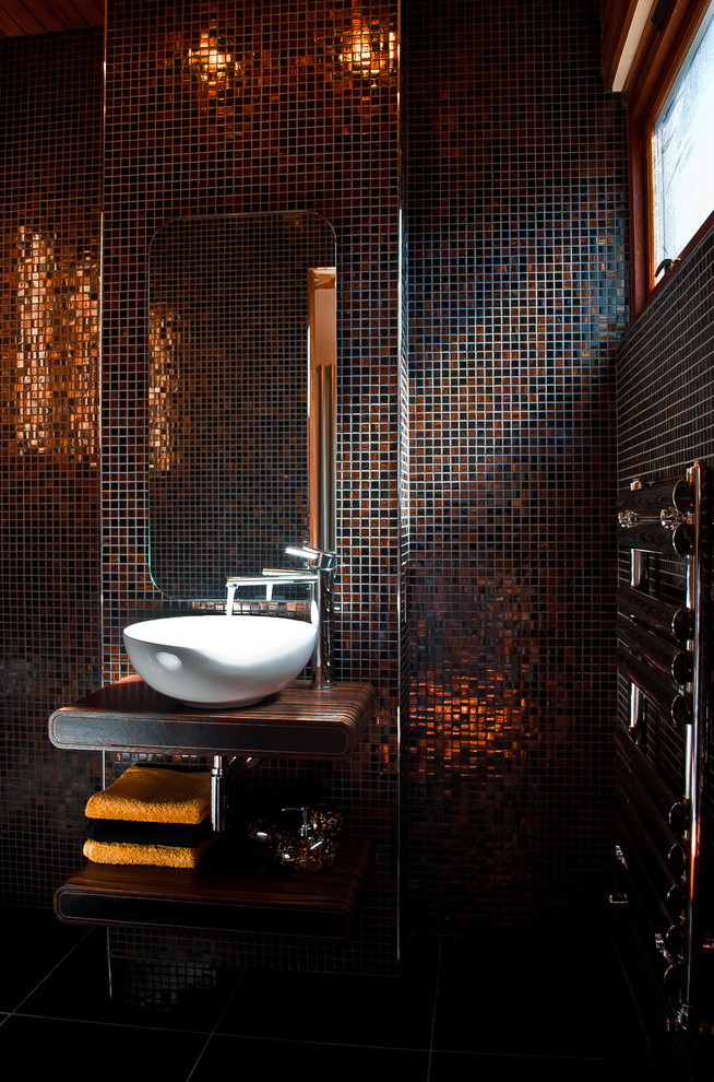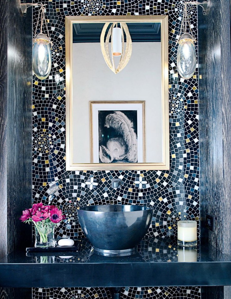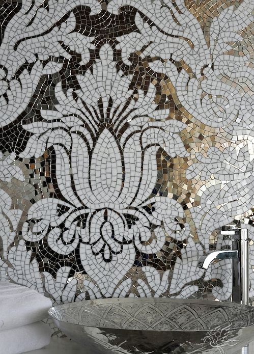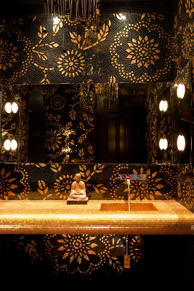 Mosaico é um método antigo de criar uma composição de azulejos decorativos. O design é composto de muitos pedaços individuais de azulejos multicoloridos, vidro ou pedra. Para fazer isso, muitas vezes usado telhas cerâmicas quebradas ou picadas ou majolica. O processo é muito demorado. Requer habilidade e experiência mínimas com mosaico, assim como uma quantidade considerável de tempo. Mas para passar por todas as dificuldades vale a pena, porque o resultado final irá exceder todas as expectativas, e o banheiro se tornará único e inimitável.