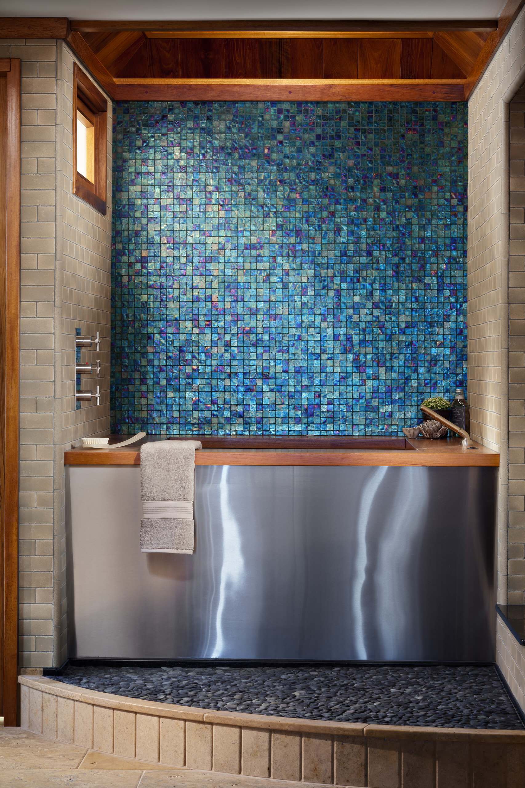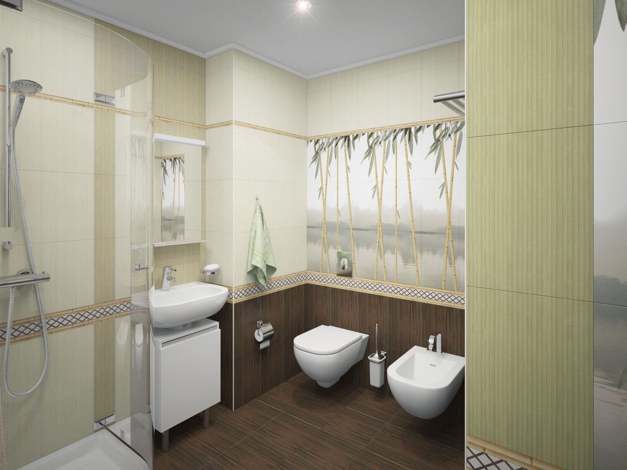- motivos naturais são típicos de pequenos espaços. Para decoração, use azulejos que imitem madeira, couro ou bambu. Conchas também são populares.