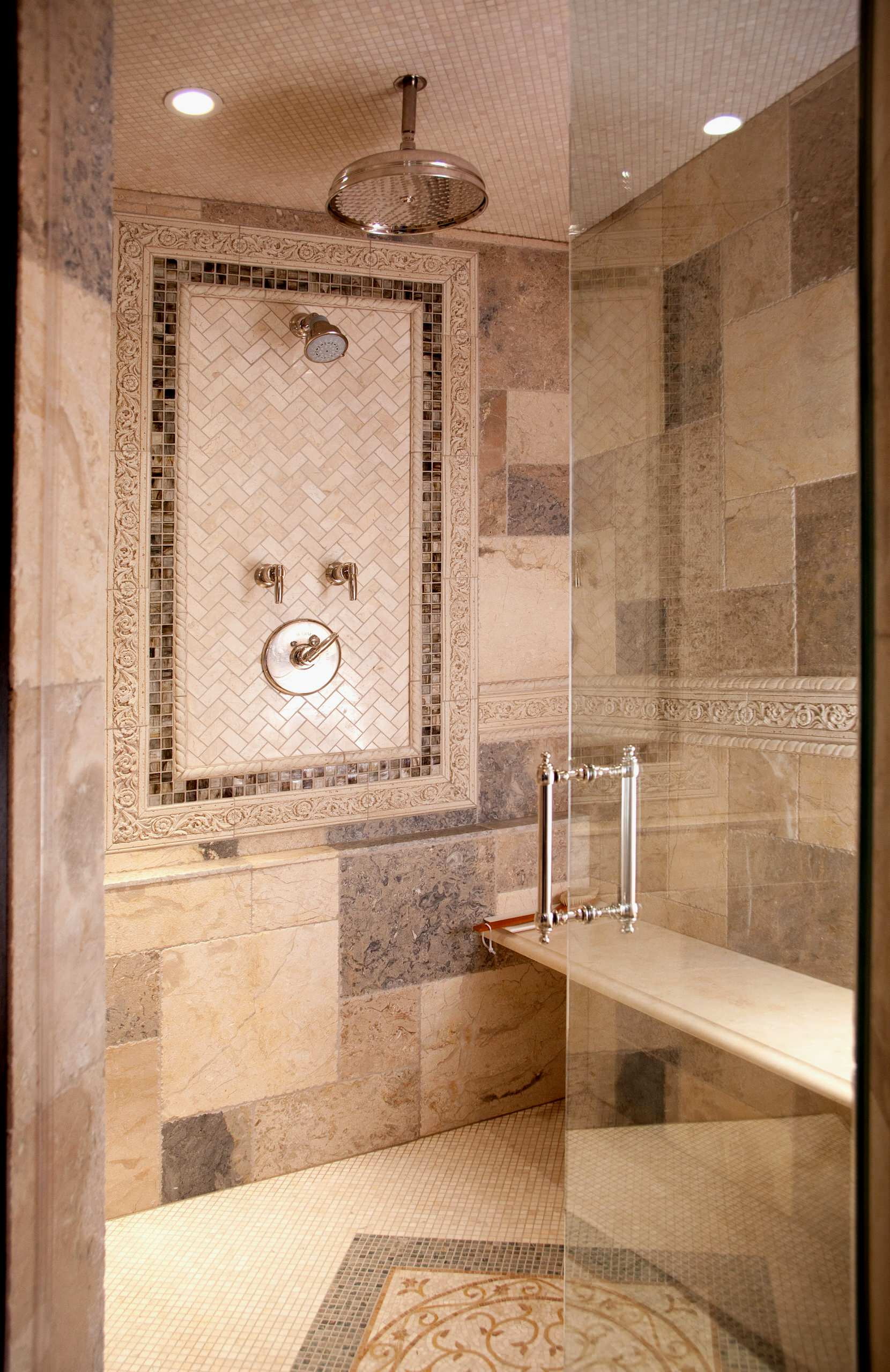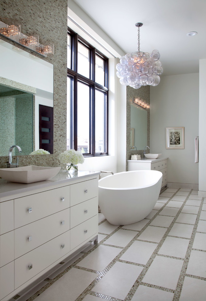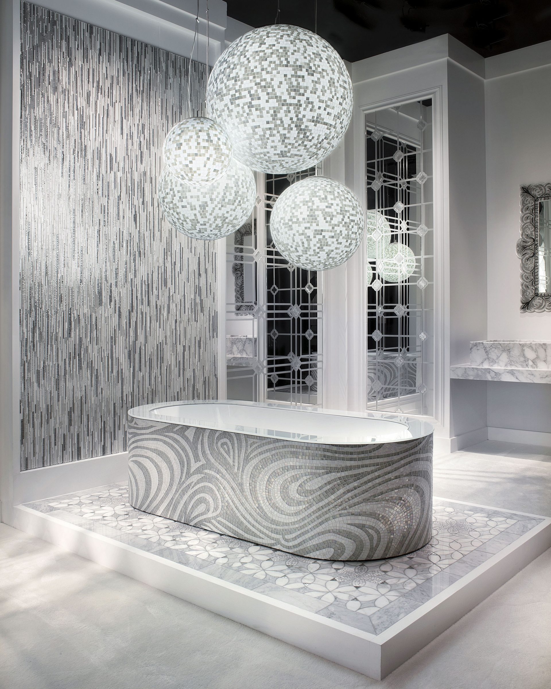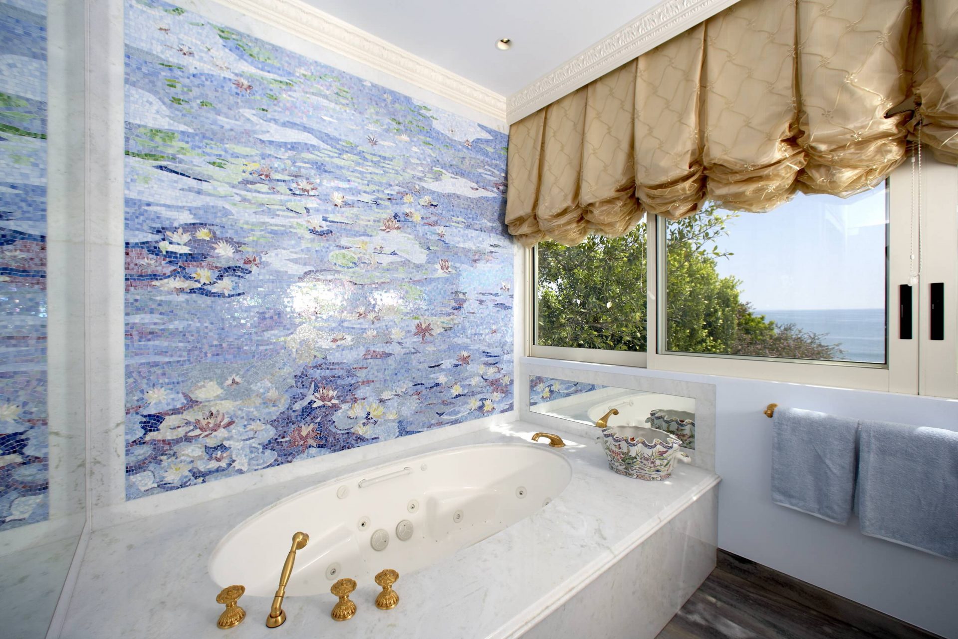 A essência do mosaico é que os detalhes devem ser colocados em qualquer ordem. O resultado é padrões únicos. O banheiro clássico é decorado com formas geométricas. A sala com o interior da direção da Provença é decorada com imagens de tons pastel ou conchas.