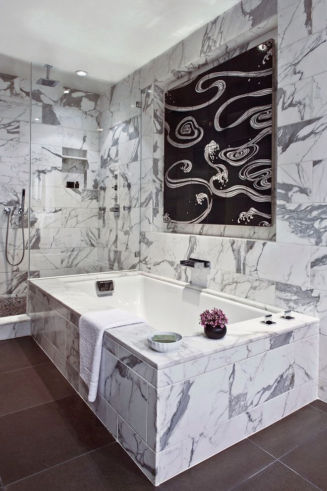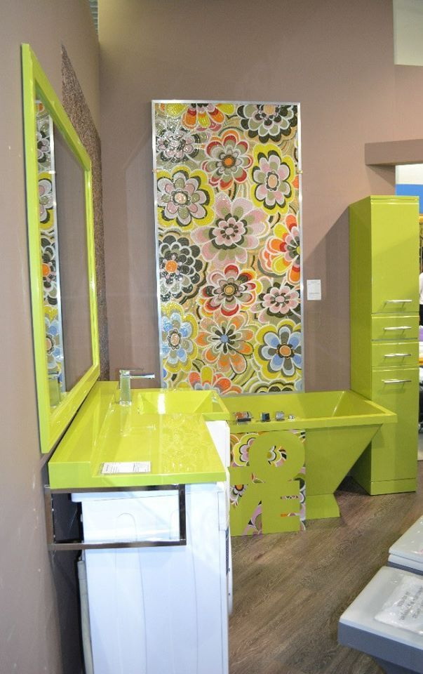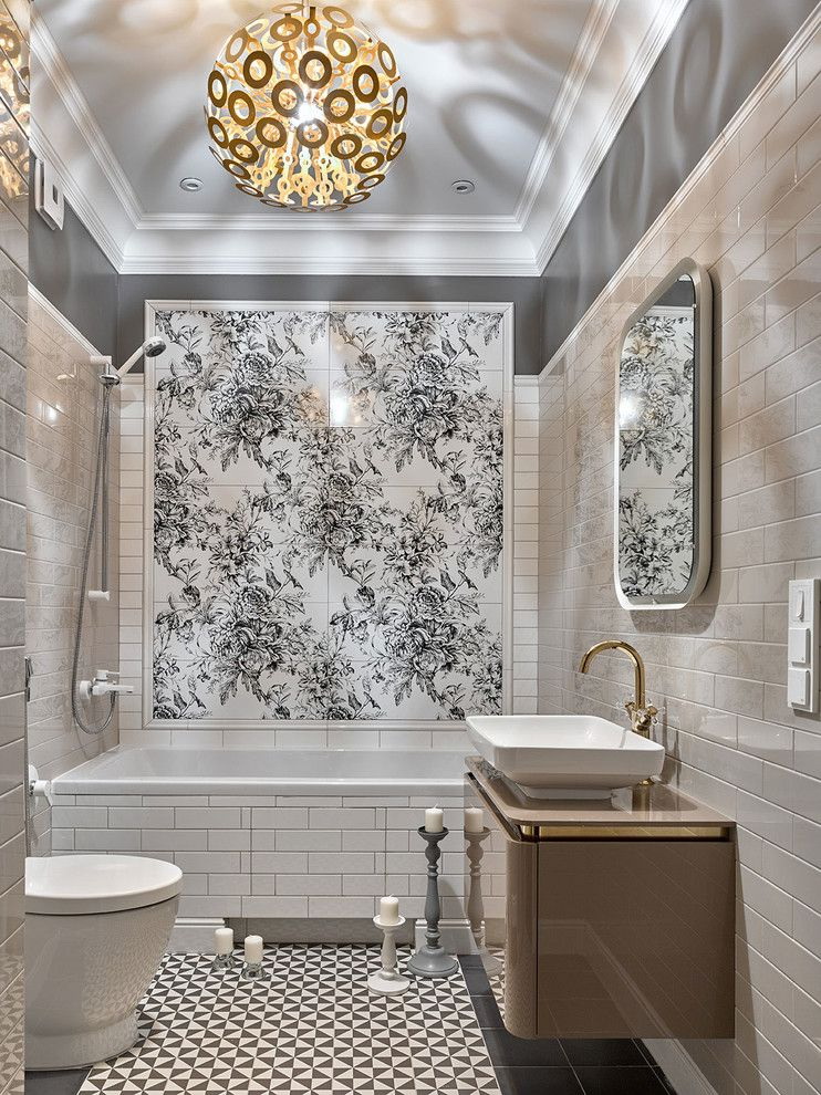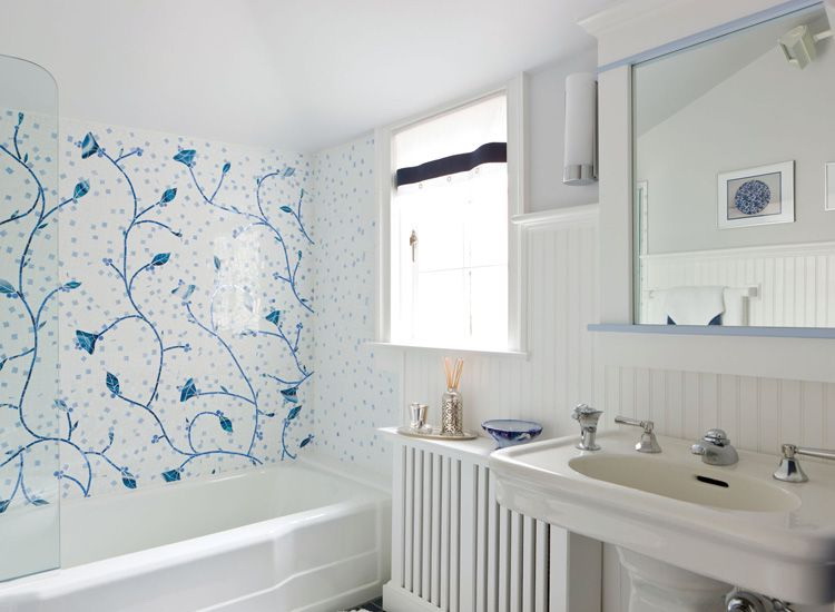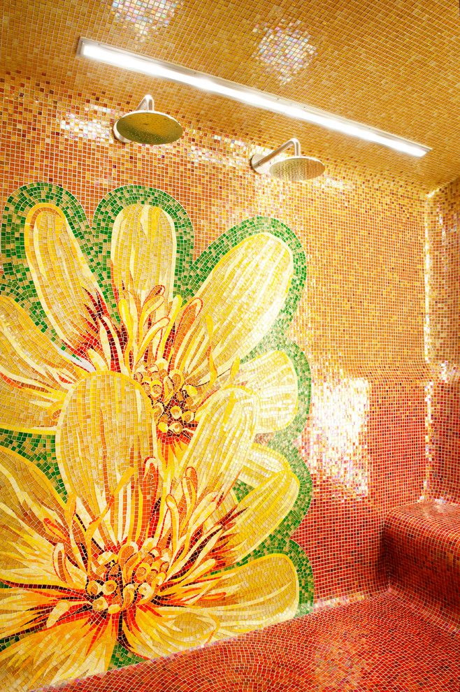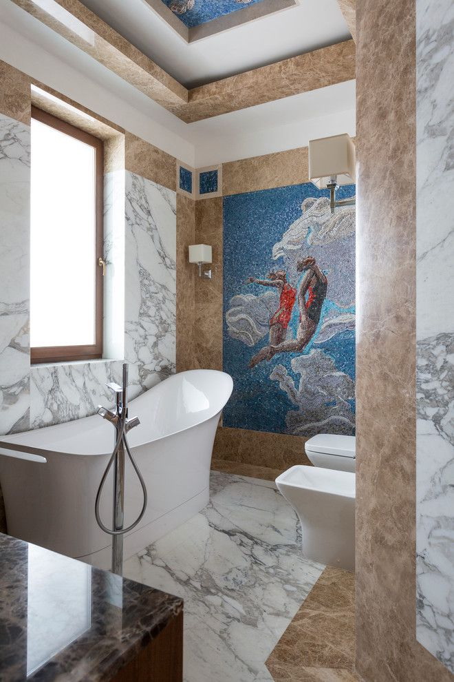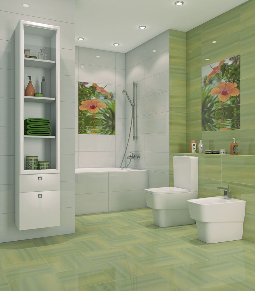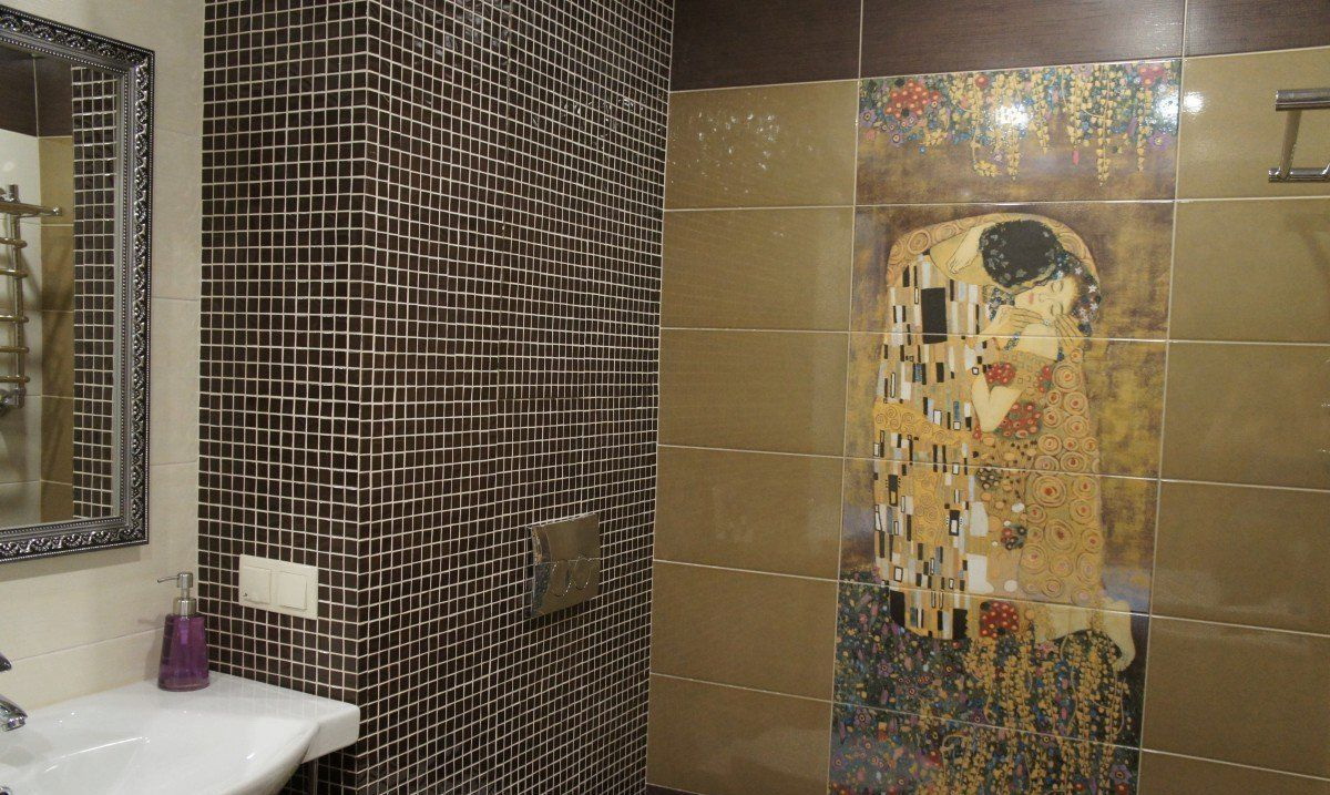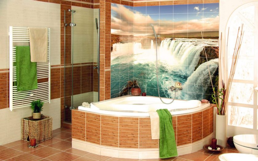 Decoração do banheiro com mural Tornou-se recentemente uma opção popular, já que praticamente todas as decisões de design são realizadas. A decoração é feita usando uma tecnologia especial que aumenta a resistência à umidade do revestimento e evita o desbotamento. Além disso, a superfície do ladrilho protege o desenho dos efeitos de produtos químicos domésticos agressivos e de alta temperatura.