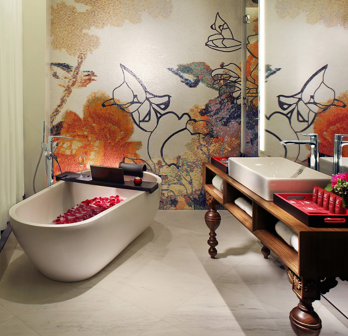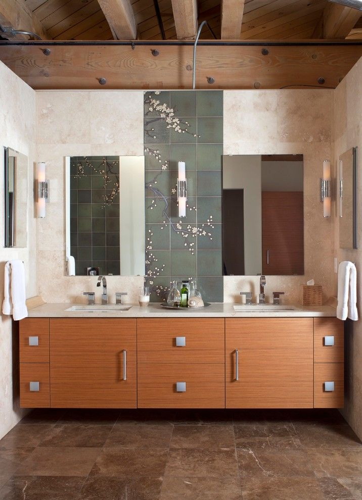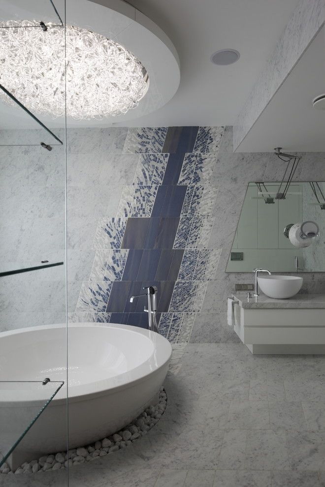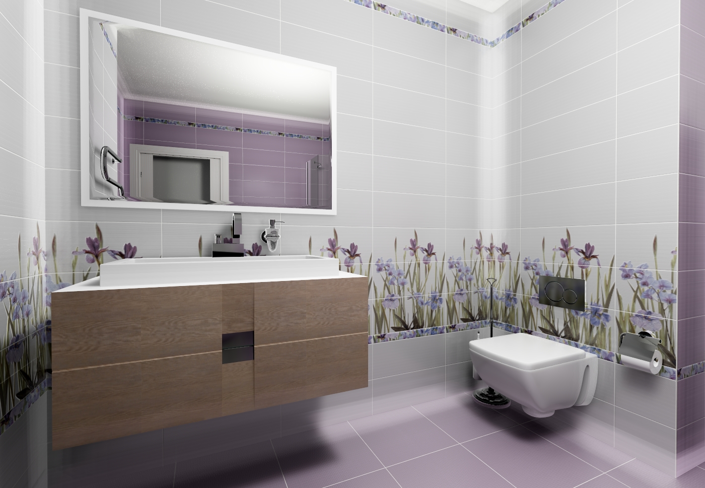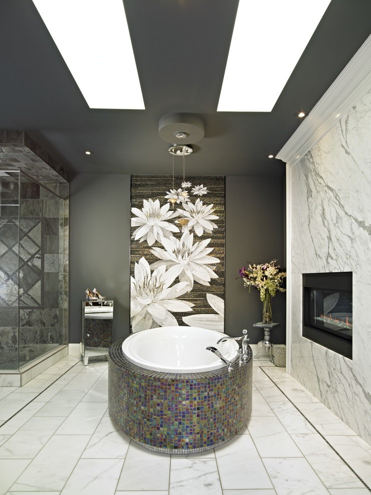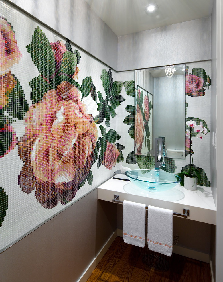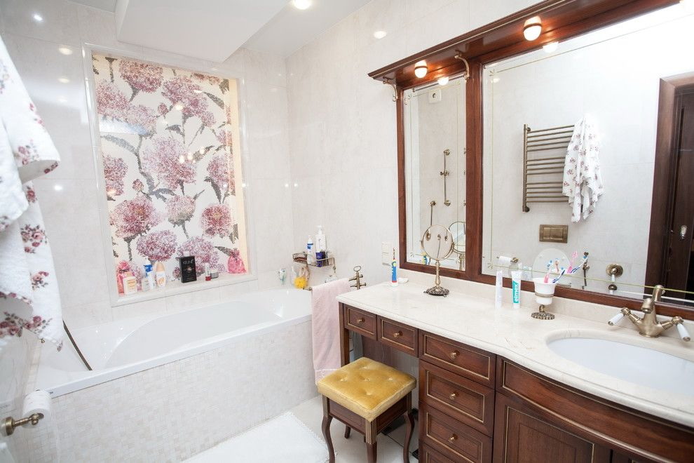 Decoração do banheiro com mural Tornou-se recentemente uma opção popular, já que praticamente todas as decisões de design são realizadas. A decoração é feita usando uma tecnologia especial que aumenta a resistência à umidade do revestimento e evita o desbotamento. Além disso, a superfície do ladrilho protege o desenho dos efeitos de produtos químicos domésticos agressivos e de alta temperatura.