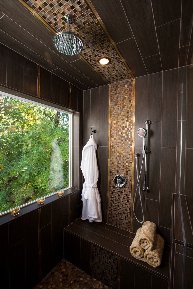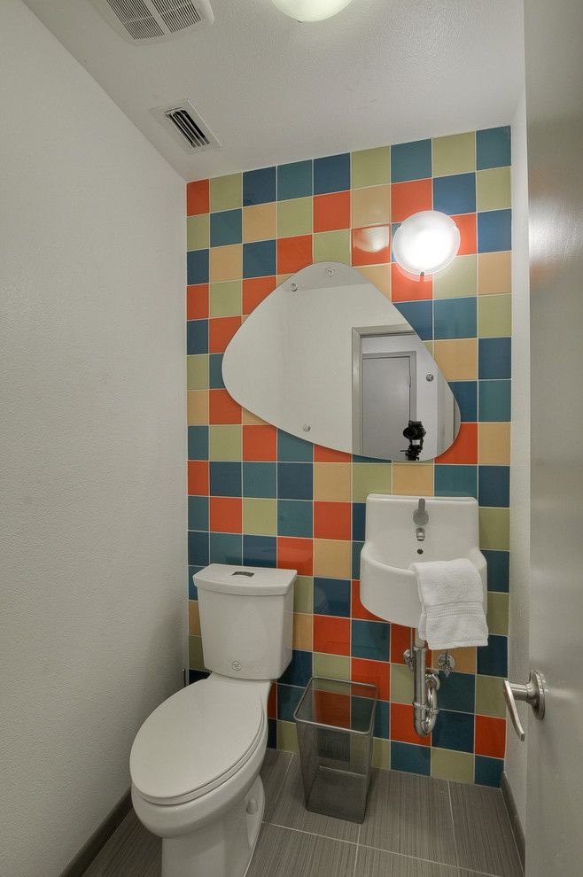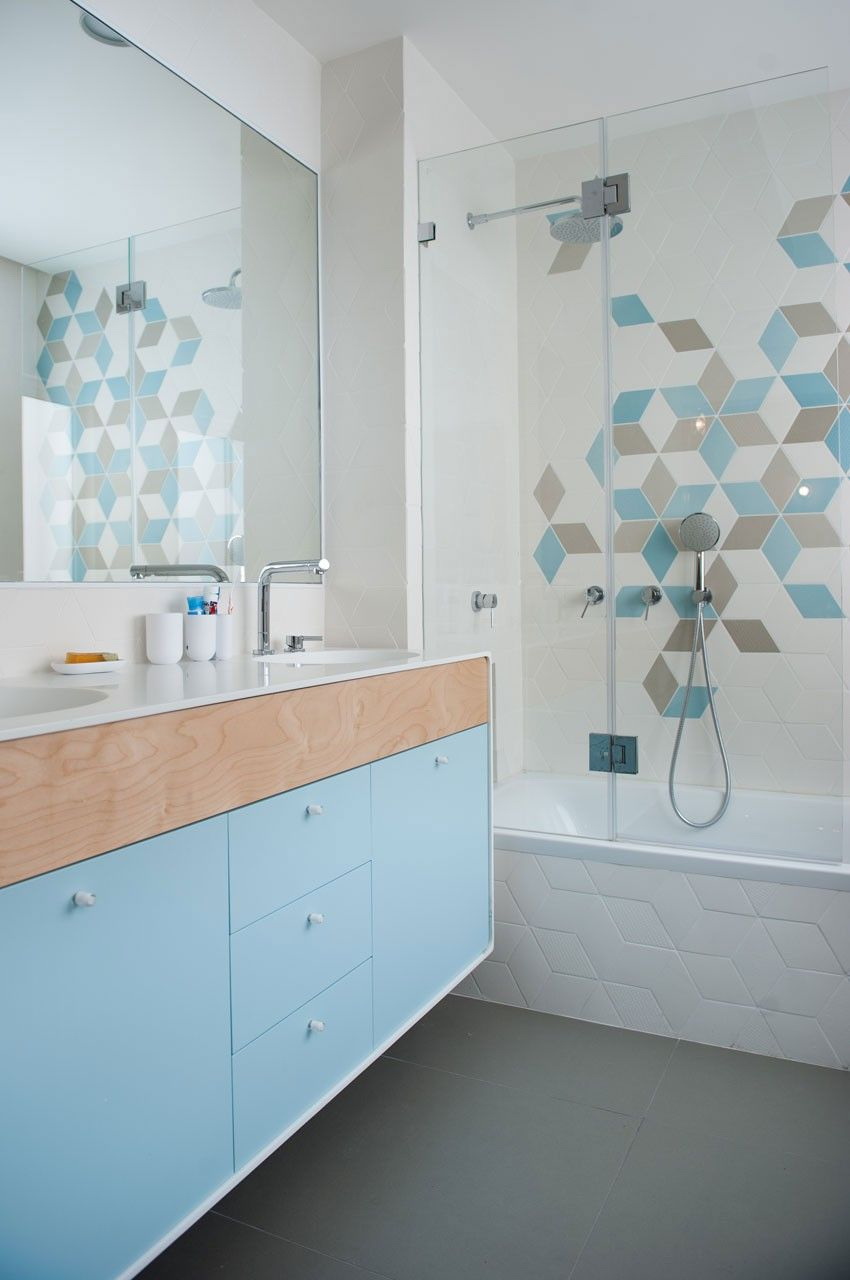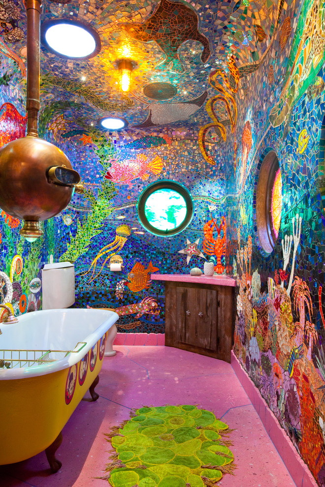 Existem várias maneiras de transformar um banheiro com uma combinação de azulejos multicoloridos e diferentes tipos de painéis:
