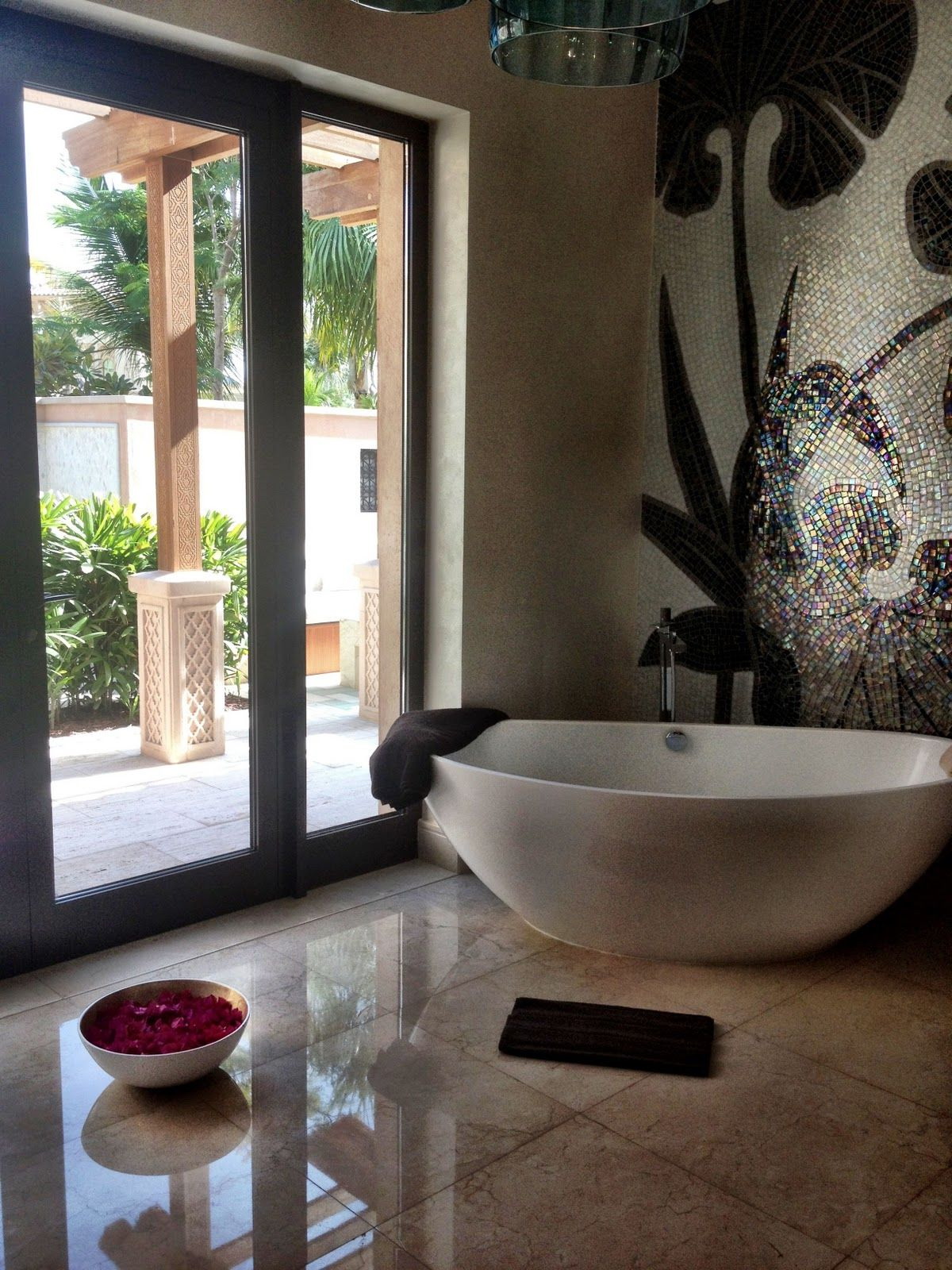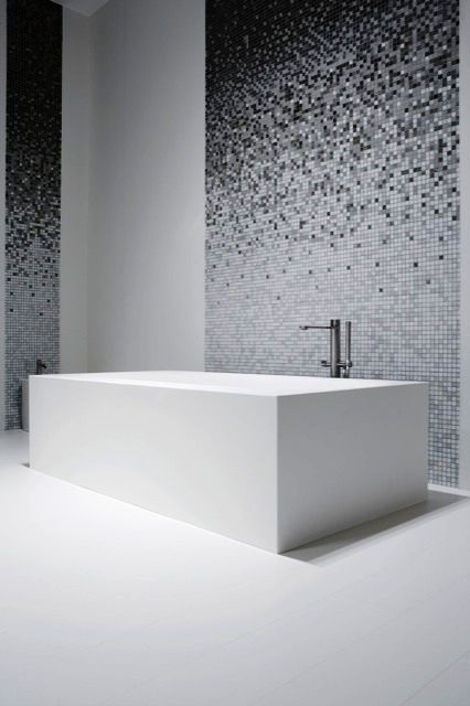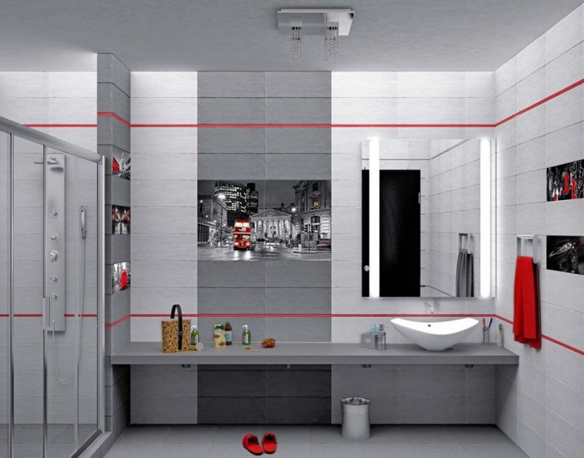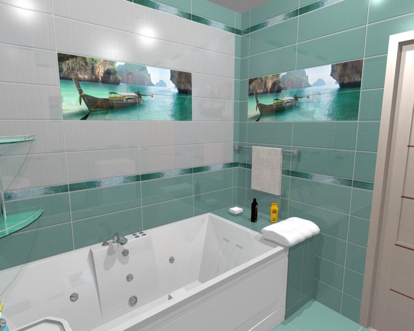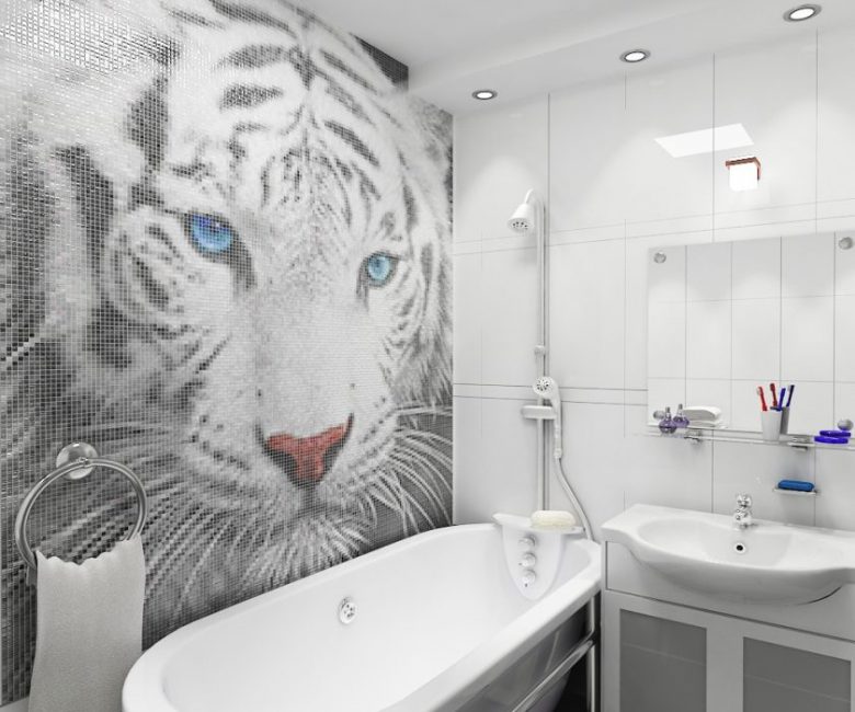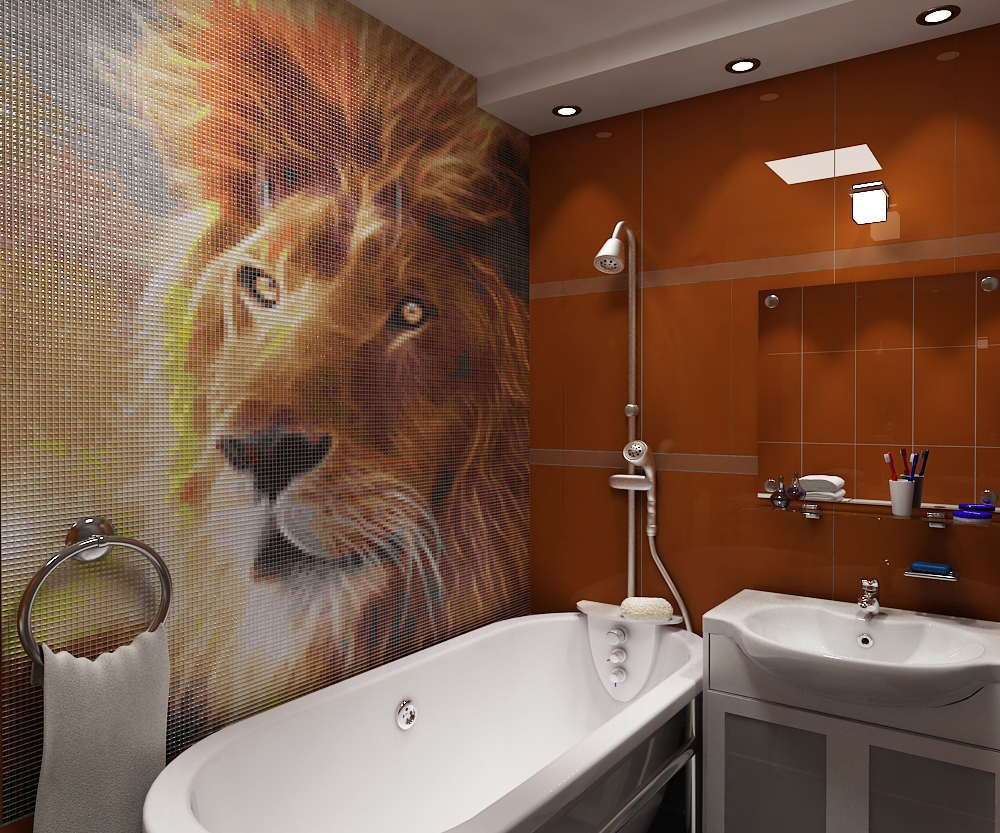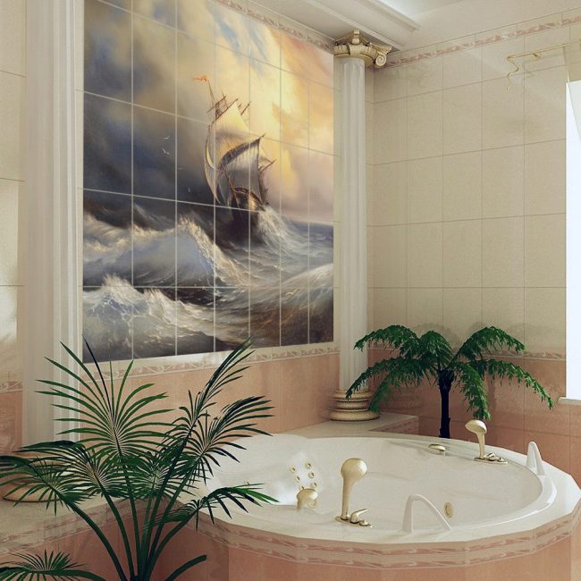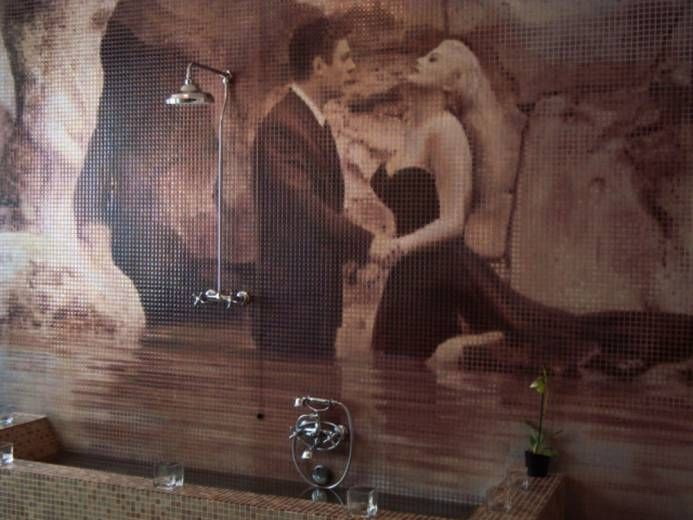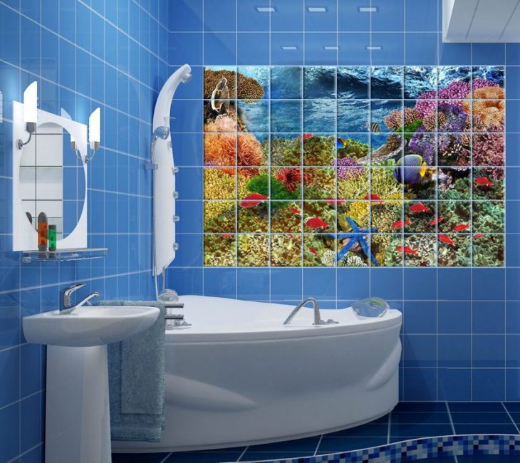 De um bloco desse tipo, você pode criar uma imagem sólida ou dividi-la em partes separadas. Para a foto selecionada foi em toda a parede, use fotos de alta resolução. Para uma pequena tela que pode ser colocada em diferentes partes do banheiro, o custo será muito menor.