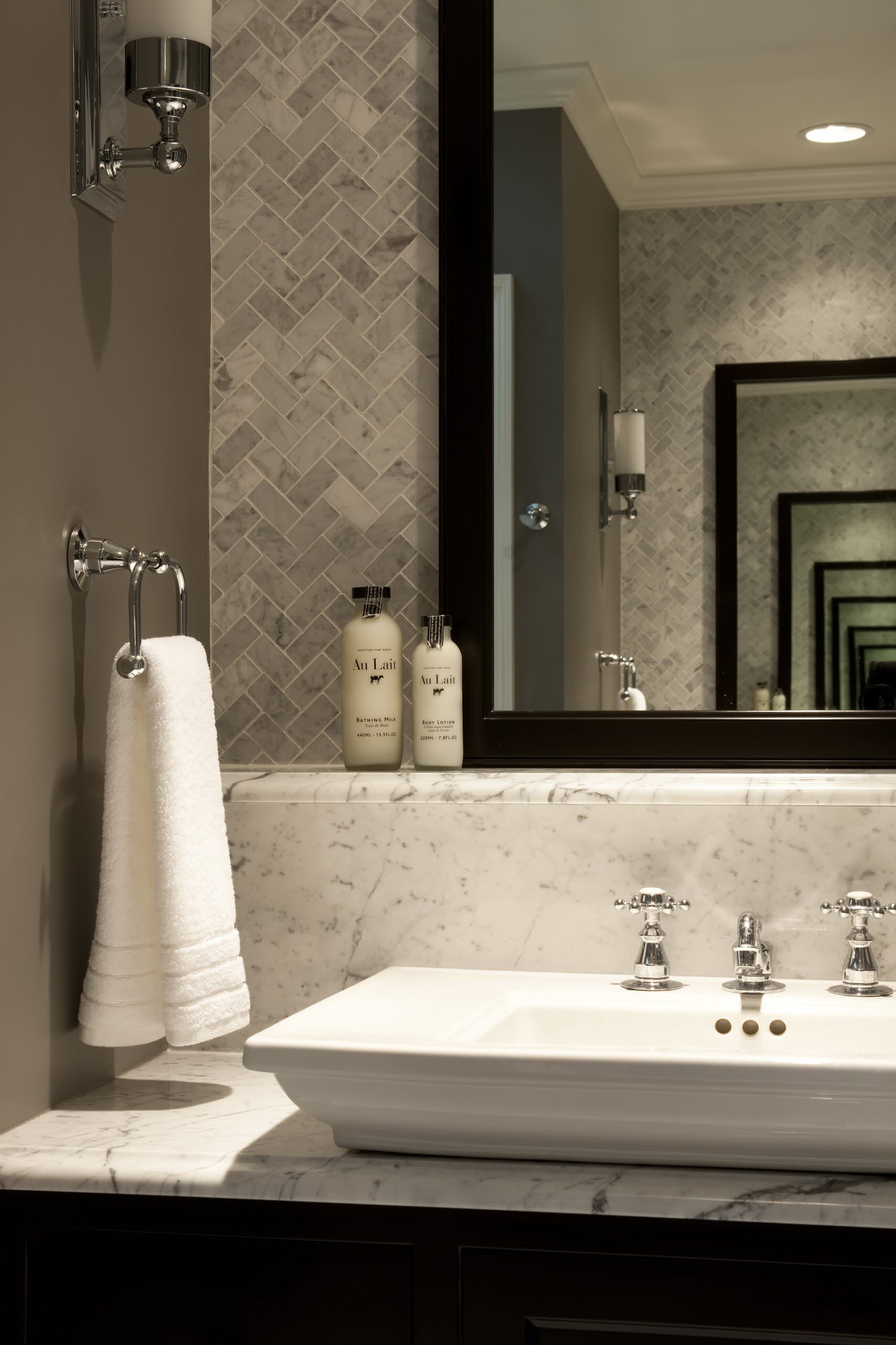 - Design clássico. O fundo escuro é separado por um friso do topo da luz. Como decoração, use painéis de painel único, que são colocados em toda a área iluminada. No perímetro superior, você pode fazer uma borda escura, alinhada em um ladrilho.