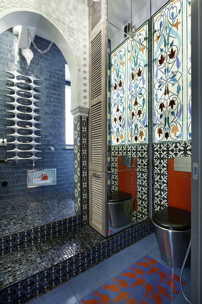 - O banheiro oriental se tornará especial se você usar padrões incomuns e cores vivas. Você não deve limitar a imaginação, você pode aplicar uma abundância de cores;