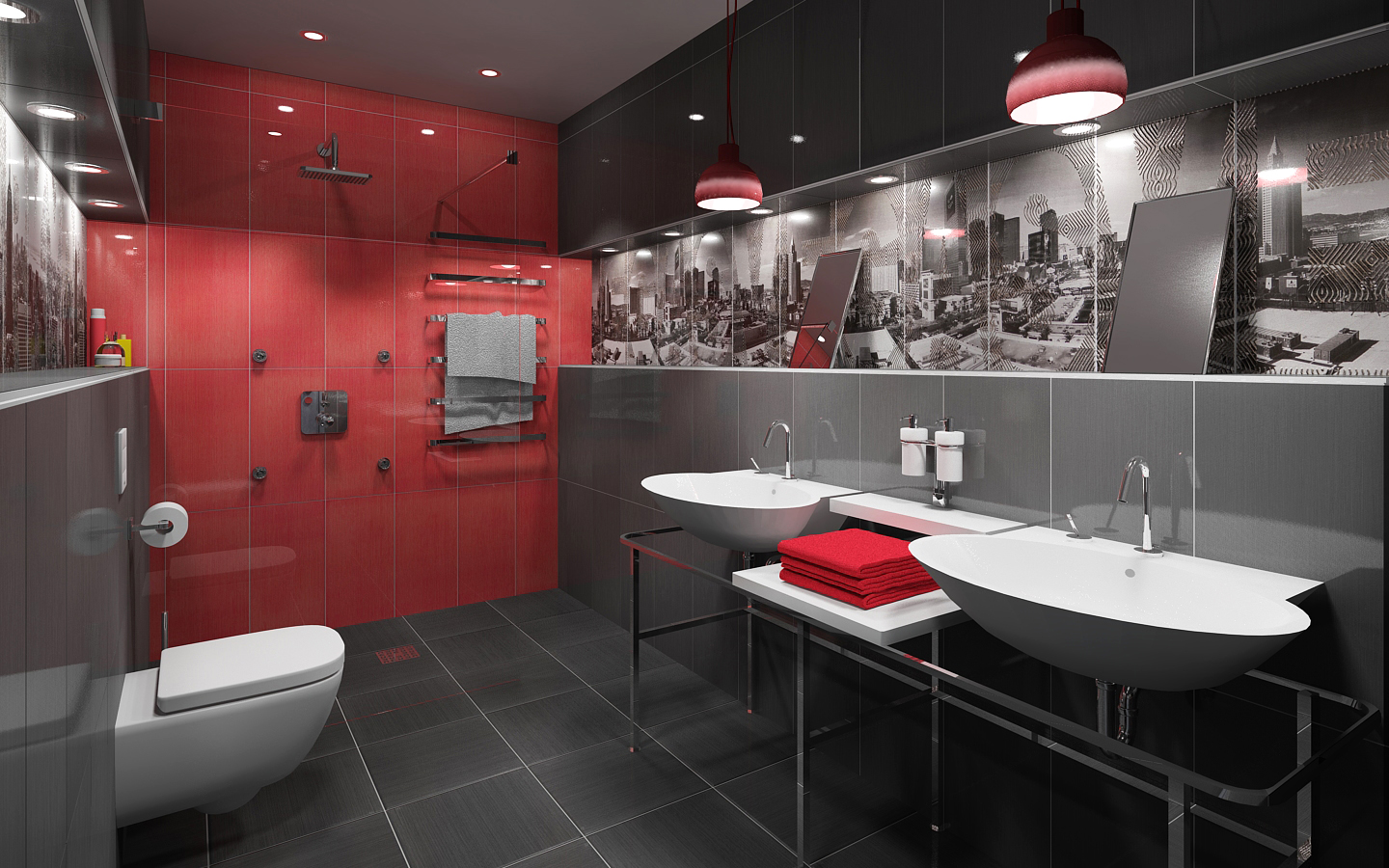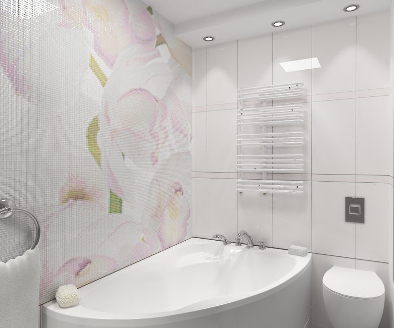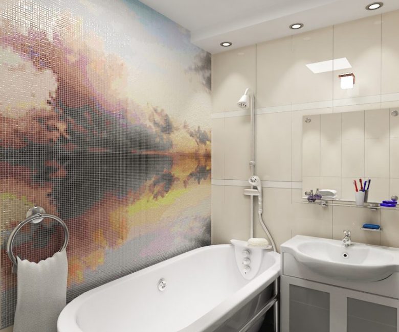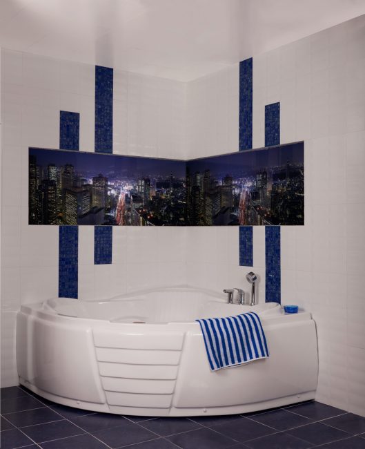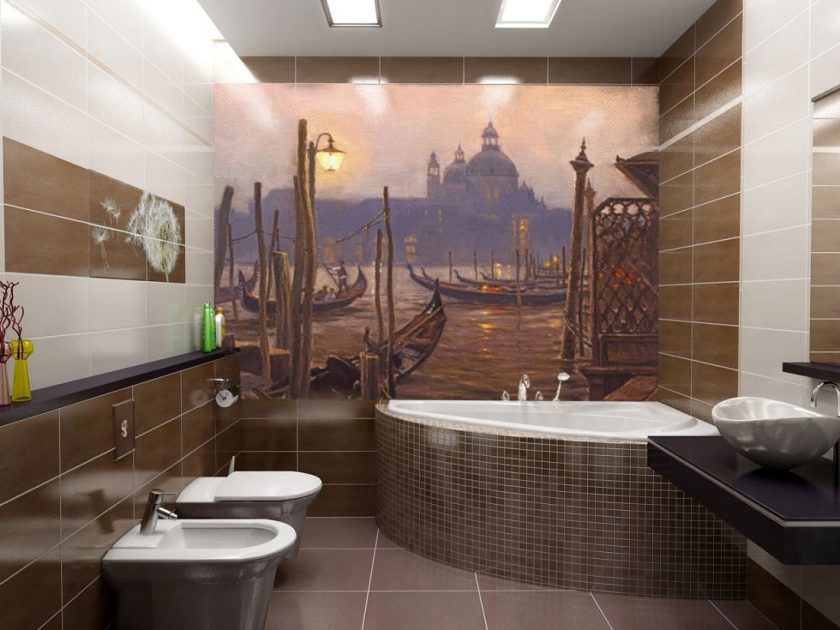 Banheiros com dimensões modestas devem ser ampliados com a ajuda de um painel colocado em um dos cantos. A imagem não precisa conter o gráfico. Muitas vezes, escolha uma abstração com um número mínimo de detalhes brilhantes com contornos claros.