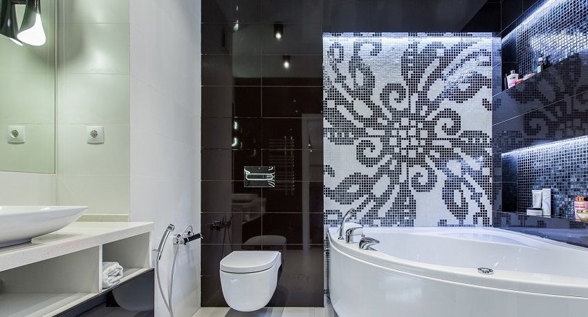 Painel de azulejos no banheiro é selecionado com base nas preferências dos proprietários da casa, o tamanho da sala e seu interior. Você pode escolher uma opção barata ou pedir uma decoração mais cara ao designer.