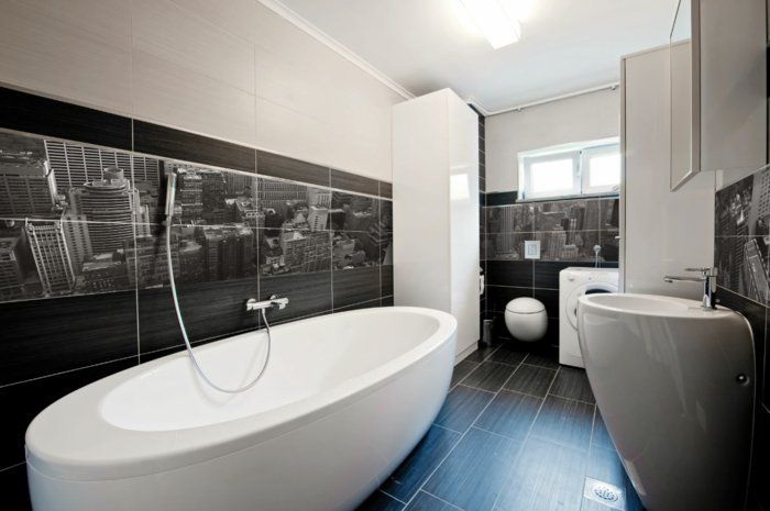 Banheiros de tamanho médio são recomendados para decorar com ornamentos em 2/3 de toda a parede. O tema será adequado a qualquer um, do que a imaginação dos proprietários será capaz.