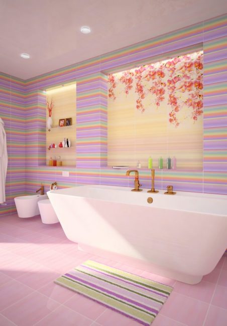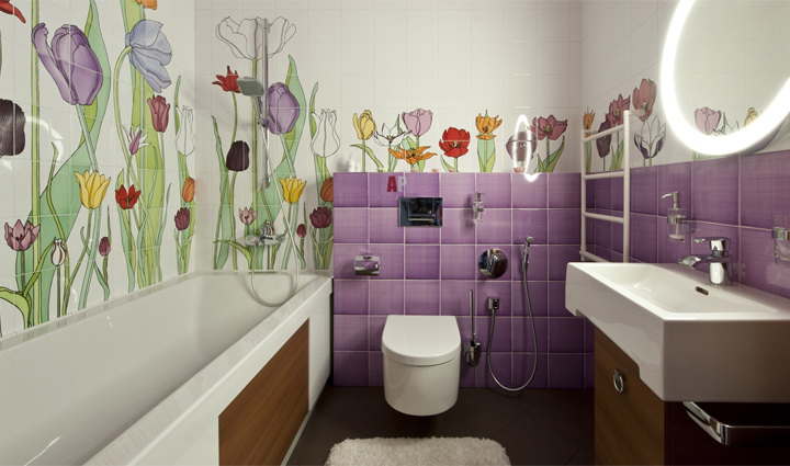 O processo de visitar o banheiro por crianças pode ser mais interessante e divertido. Para fazer isso, a área acima da pia ou do próprio banho deve ser decorada com um painel de azulejos que mostre personagens de desenhos animados ou personagens de contos de fadas.
