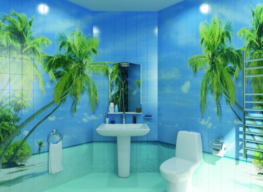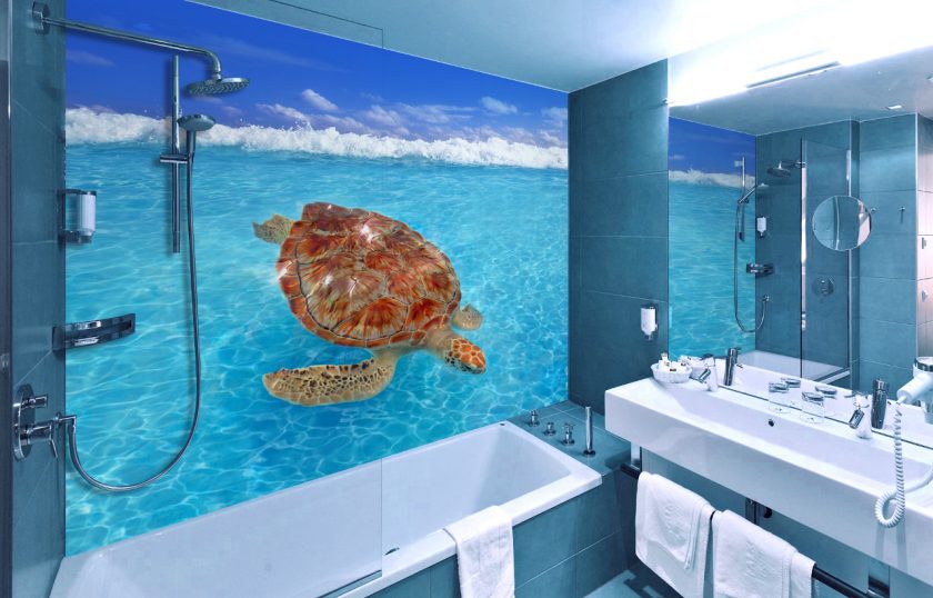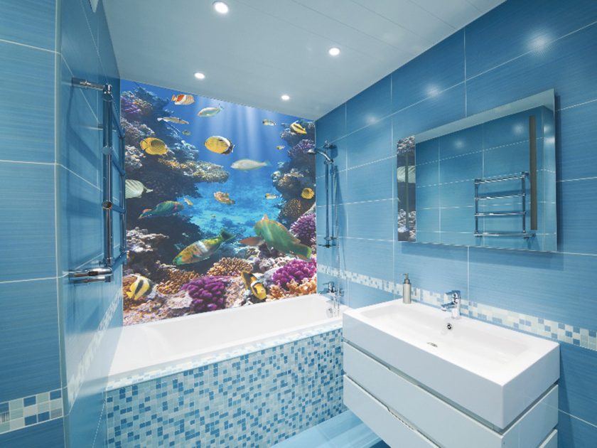 - imagem da vida selvagem ou praias de países exóticos. O interior do banheiro vai olhar harmoniosamente cachoeiras, peixes, conchas e medusas. Romântico será a imagem de pequenos barcos com velas brancas;