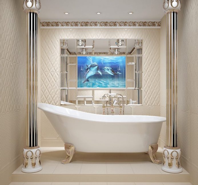 Os proprietários de grandes salas usam algumas recomendações sobre o fato de não valer a pena com a escala. Você pode pensar em algo incomum, por exemplo, colocar todo o mosaico da parede. Golfinhos, navios, marinhas, animais selvagens podem ser representados no painel de mosaico.