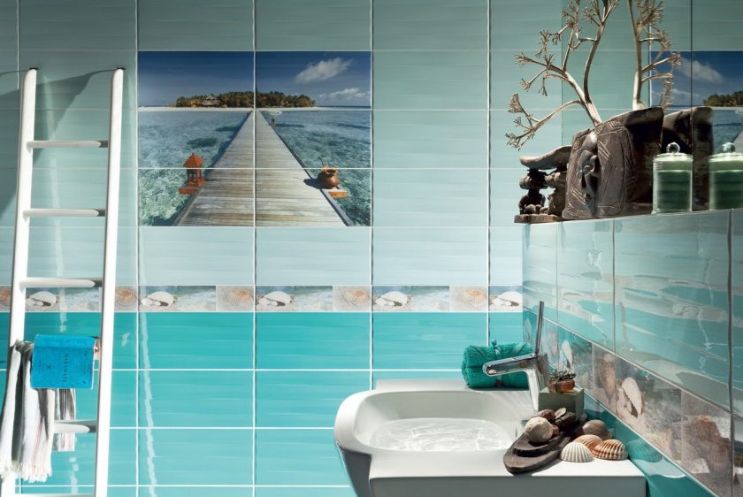 - telha com motivos marinhos promove relaxamento. Pode ser navios, paisagens de praia, peixes, conchas e muito mais. Esta composição é combinada com o interior no estilo do Mediterrâneo;