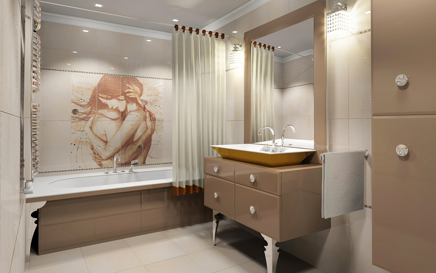 As mais orgânicas são composições, cuja coloração coincide completamente com a cor das paredes do banheiro. Imagens brilhantes visualmente empurrar as paredes e aumentar a propaís As cores quentes criam uma atmosfera íntima.. Acentos brilhantes se encaixam em quase qualquer design, mesmo no minimalismo moderno, e a aparência permanecerá original.