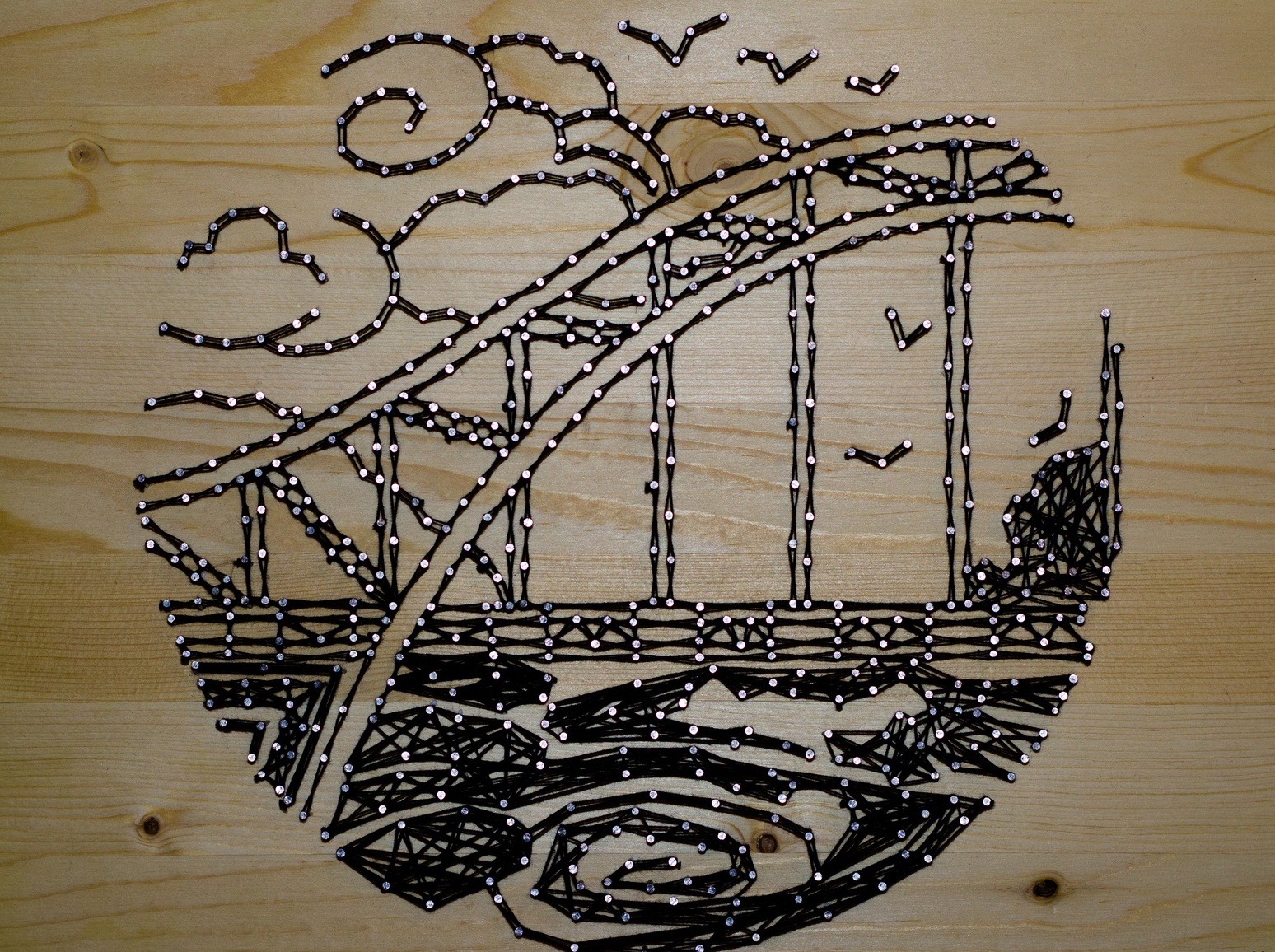 - Um esboço do futuro mural (desenho) é aplicado ao papel. Em seguida, é aplicado à base e fixo. As unhas são marteladas ao longo do contorno do desenho: quanto menos elas estiverem entupidas, maior será o desenho.