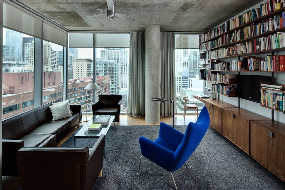 O estilo tem que negligenciar - livros podem ser colocados diretamente no chão. Certifique-se de definir a iluminação correta, que deve estar fria. Ao longo do perímetro são luminárias maciças. Como uma luz adicional, é melhor escolher lâmpadas de assoalho, em vez de luzes de parede.