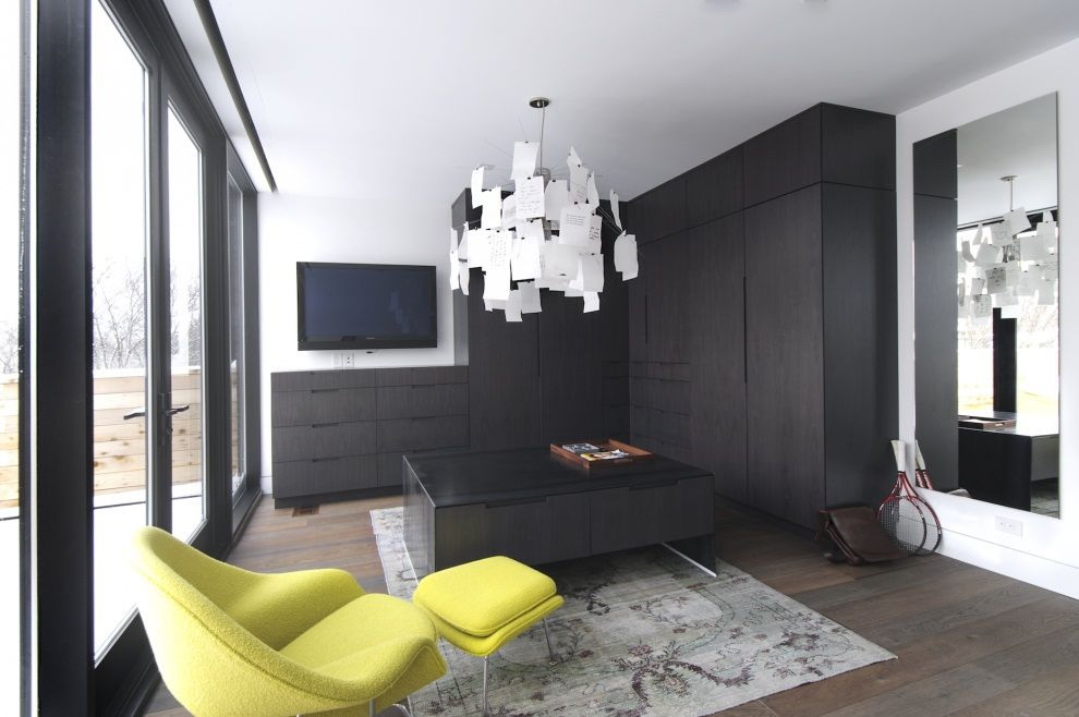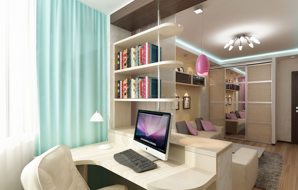 - o quarto e escritório - mais frequentemente usado esta solução para combinação. Para um espaço pequeno, seria aconselhável comprar uma cama transformadora. O produto se transformará em um armário no momento certo, liberando espaço no quarto para a área de trabalho. Aqui, também, uma tela comum pode ser usada para delimitar o espaço;