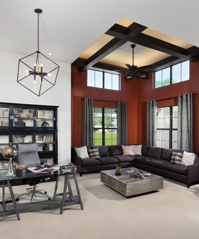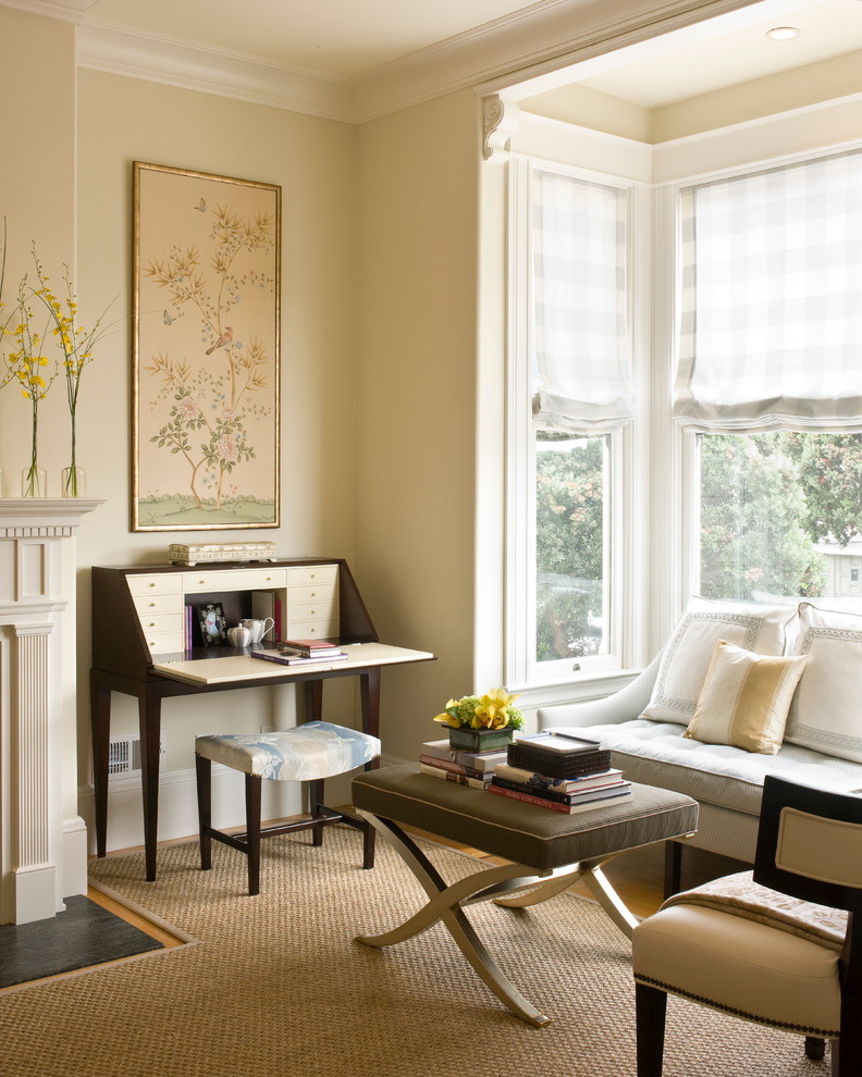 Na decoração do teto, deve-se dar preferência à pintura e, melhor ainda, colocar sobre ela vigas de madeira ou de metal. Parquet é colocado no chão.