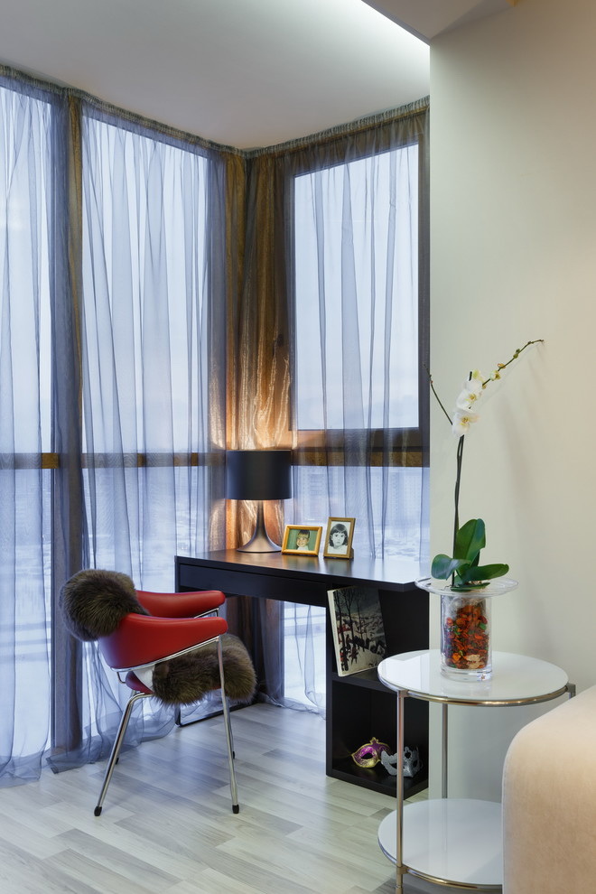 - a combinação de uma sala de estar e um escritório particular - se houver uma sala de estar separada no apartamento, independente da sala de jantar, você poderá entrar com sucesso em um escritório particular. É muito simples fazer isso separando o espaço de trabalho do escritório com uma tela estilosa comum;