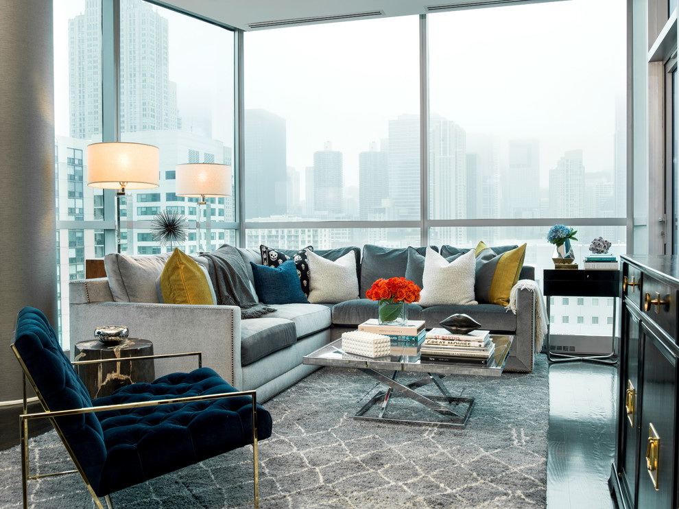 O design de salas no estilo de alta tecnologia implica em maior funcionalidade. Normalmente, o estilo parece um espaço saturado com objetos de vidro e ferro, com uma cor monocromática das paredes e do teto.