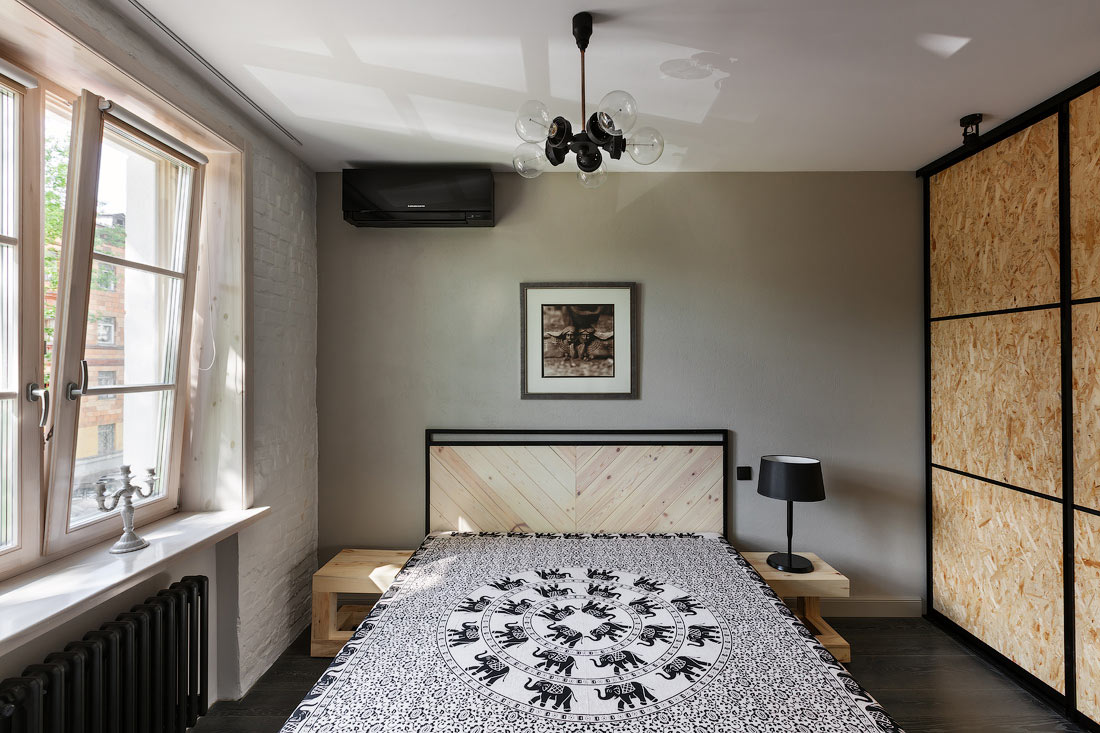 As janelas estão decoradas com cortinas de luz. A tinta é aplicada no teto. Opções suspensas, como um sinal de modernidade, não podem ser usadas.