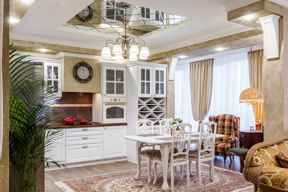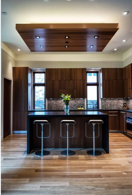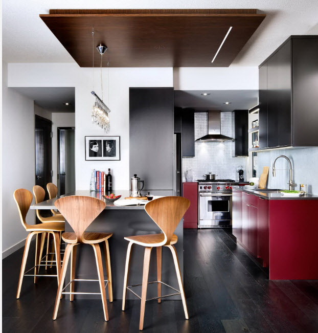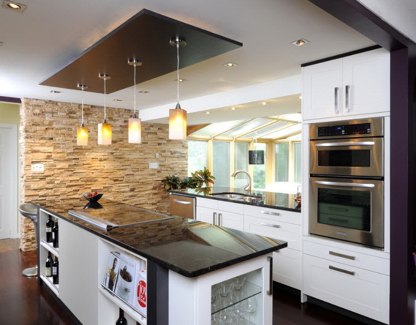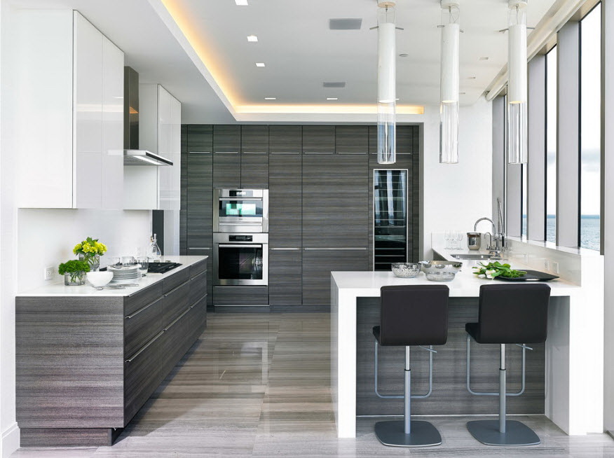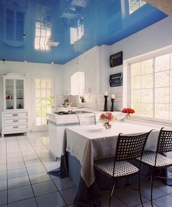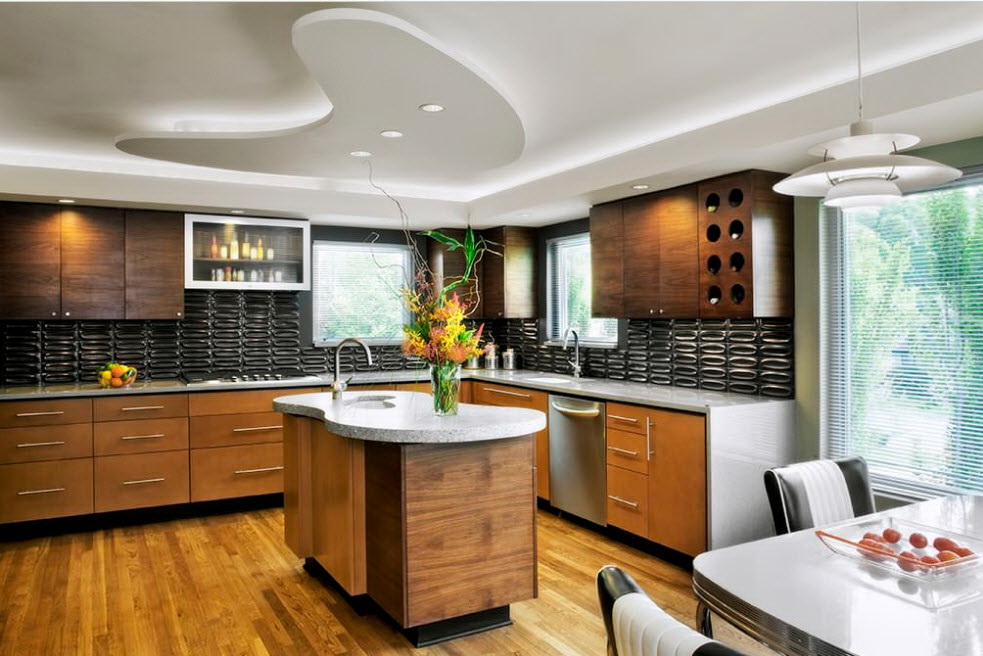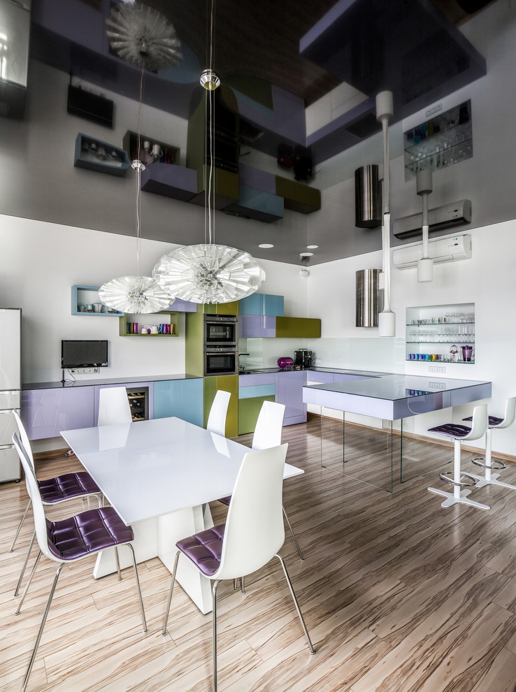 Cozinha o teto parece melhor de painéis com uma superfície brilhante. É mais fácil de limpar a fuligem gordurosa de um forno a gás, ao contrário dos painéis com relevo ou relevo profundos. A cor ou padrão pode ser escolhido para combinar com a cerâmica usada. telha, papel de parede ou cozinha de móveis.