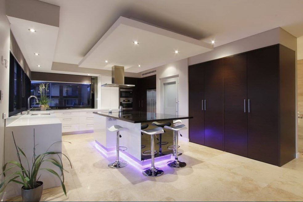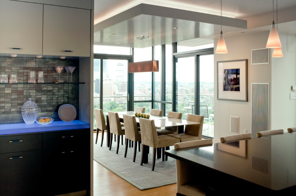 A iluminação de salas com tetos de painéis de plástico pode ser realizada usando projectores embutidos ou de outras formas acordadas com o cliente ou o proprietário da sala. Às vezes, com uma altura adequada da sala, o equipamento para ventilação e refrigeração de ar é instalado acima do nível de plástico.
