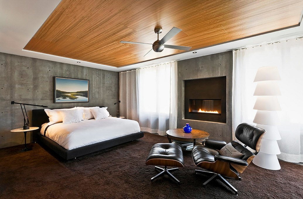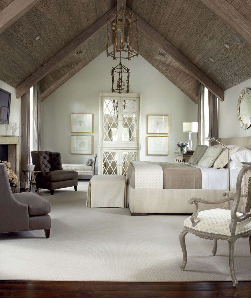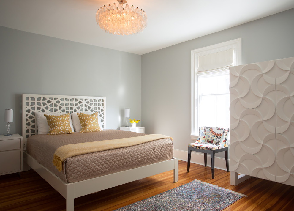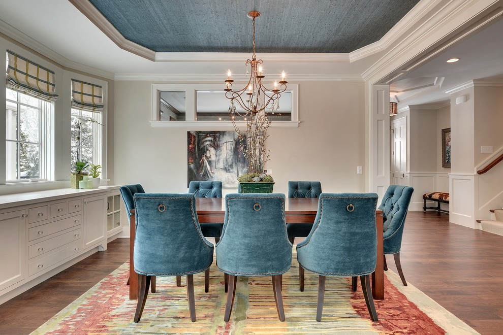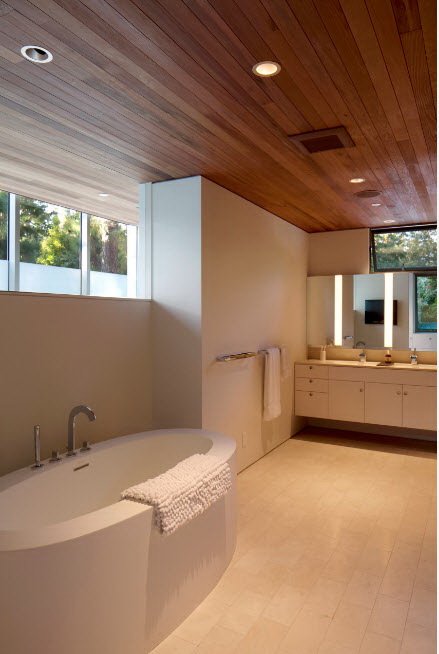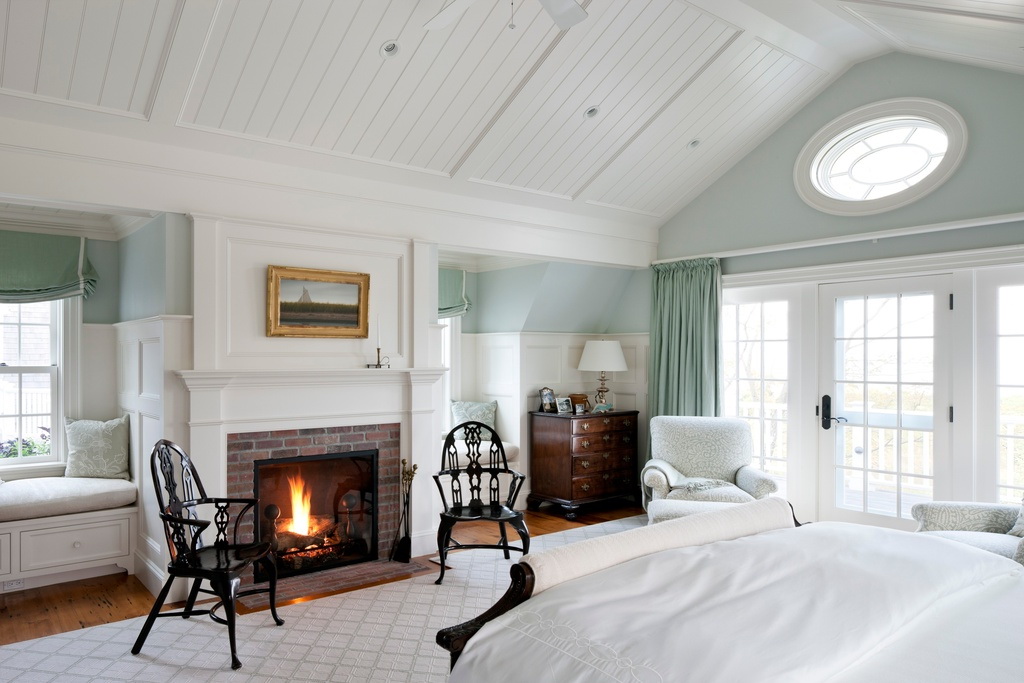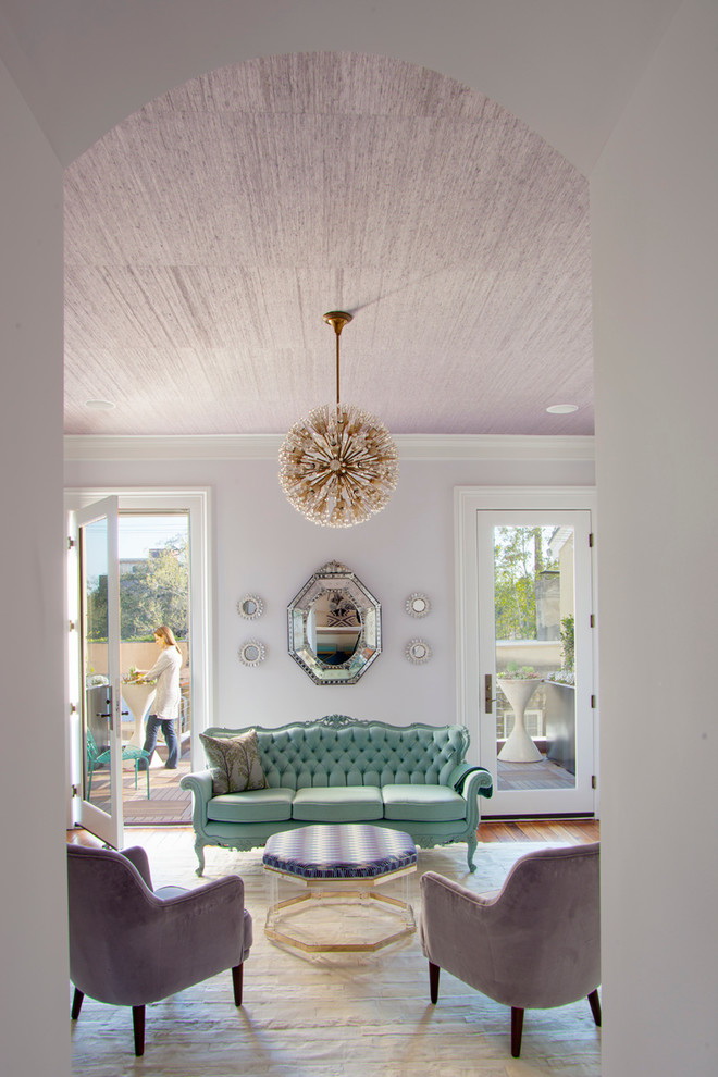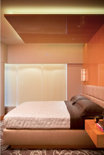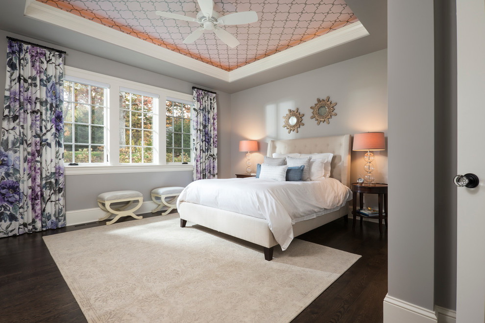A localização das costuras ao longo do olhar, olhando para o teto, visualmente faz o quarto mais longo e mais largo.