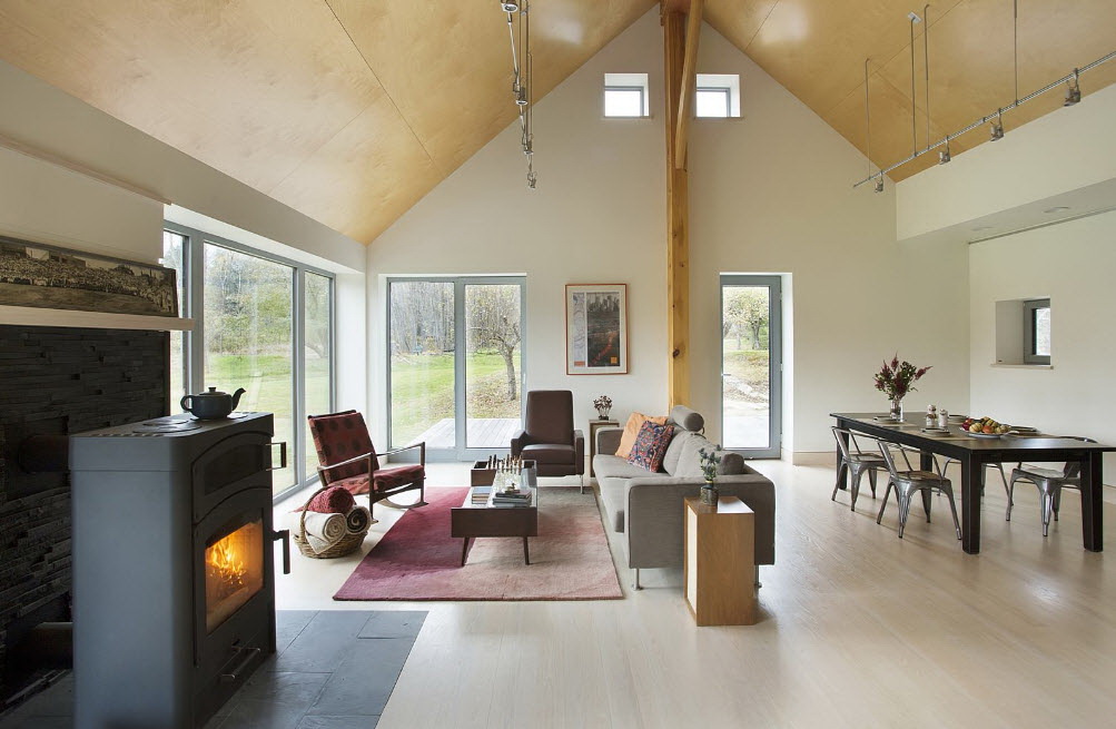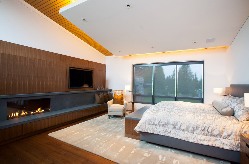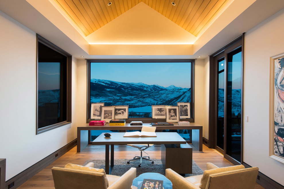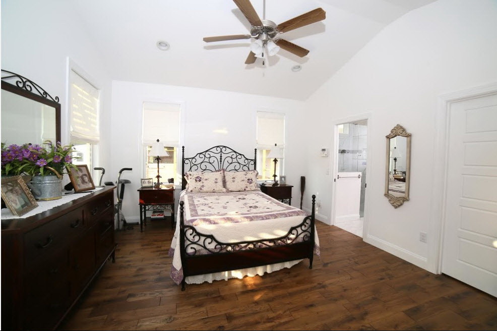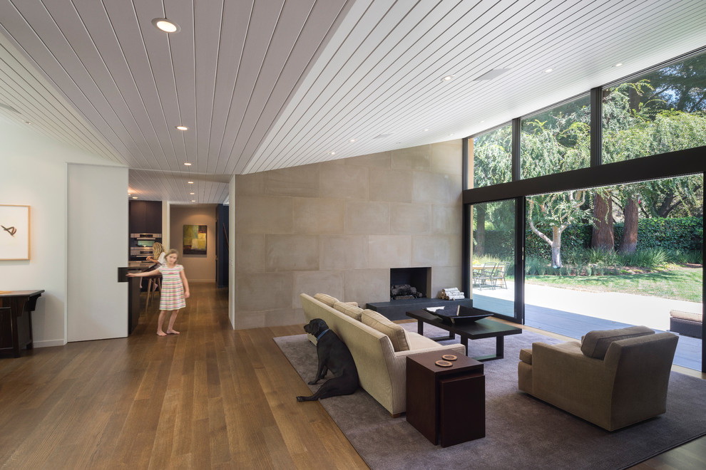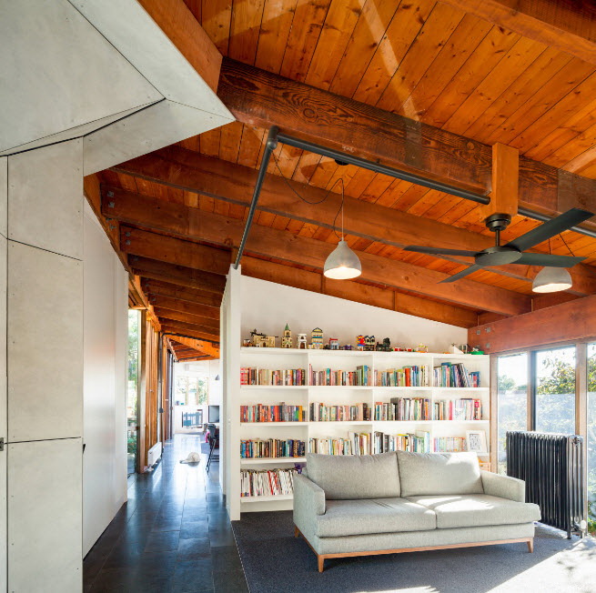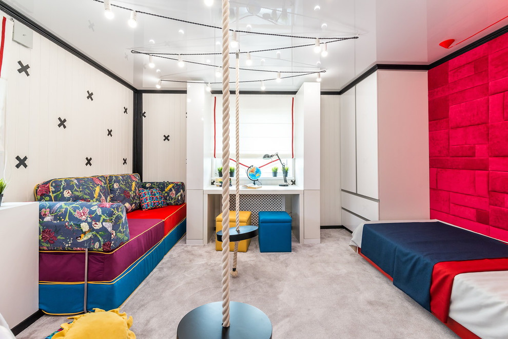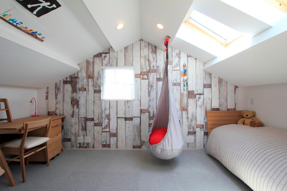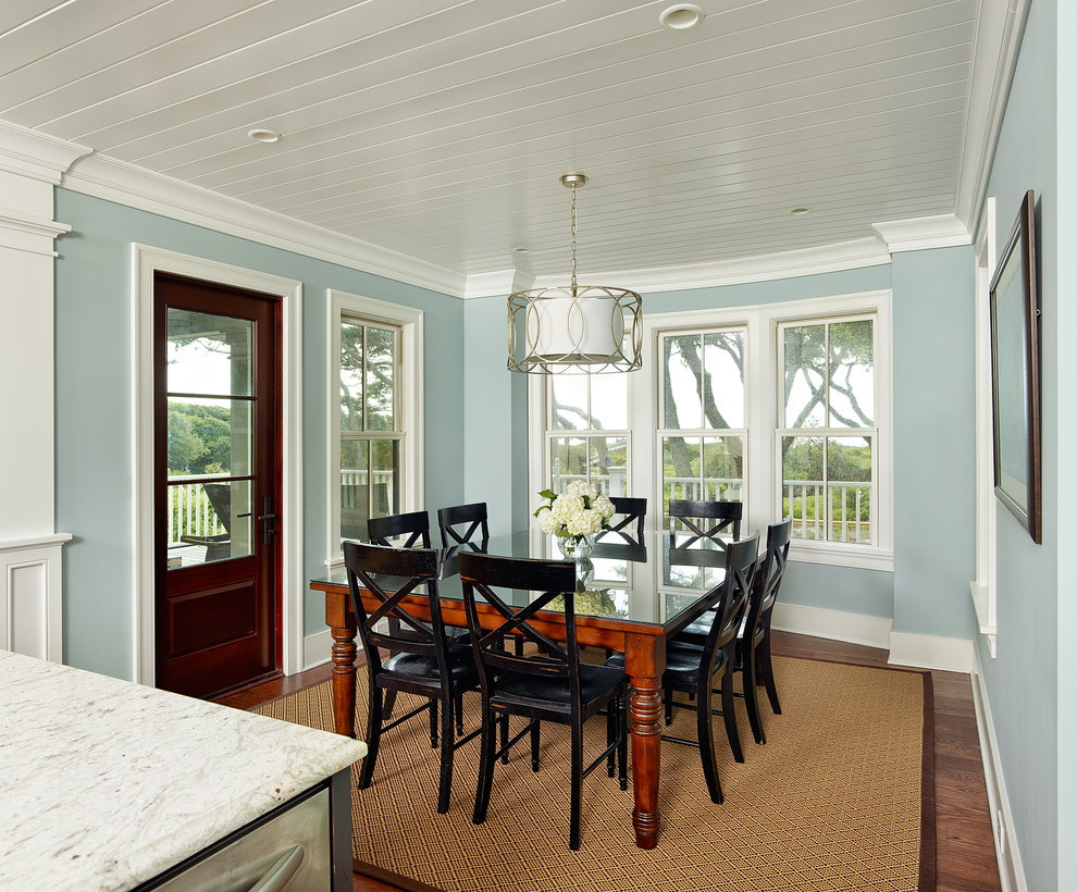 A localização das costuras ao longo do olhar, olhando para o teto, visualmente faz o quarto mais longo e mais largo.