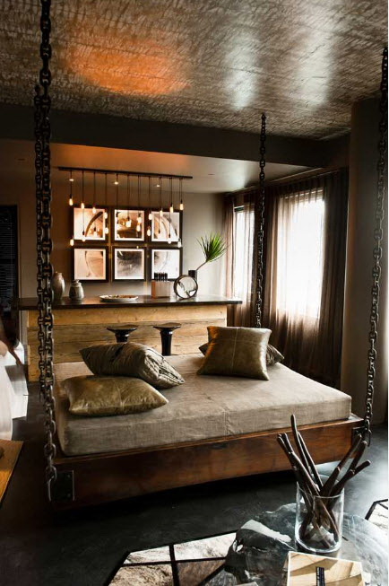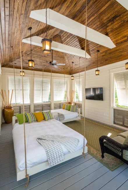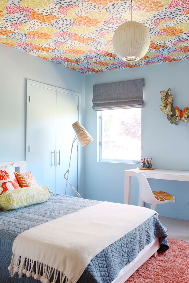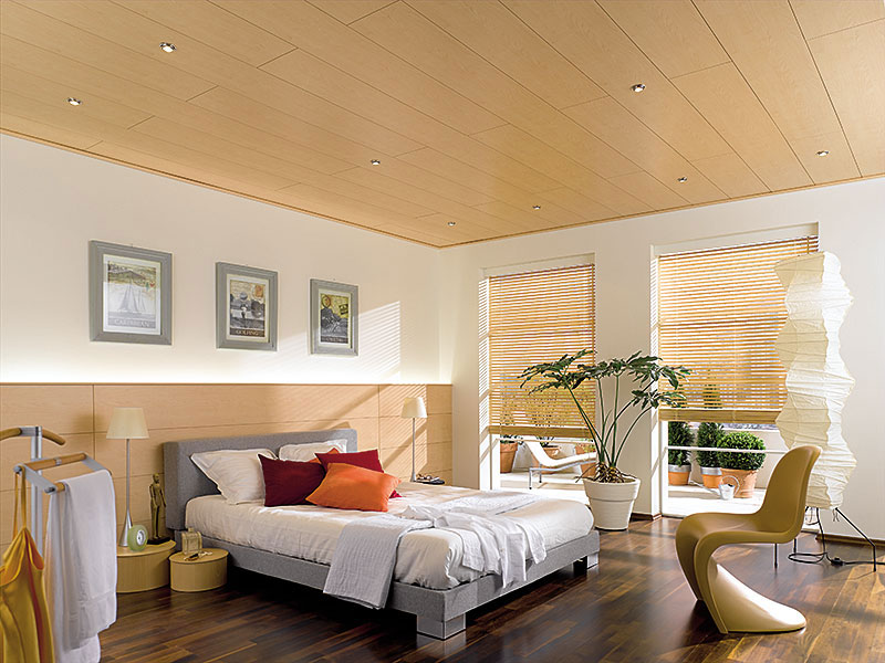 Tetos em dormindo salas com uma altura de 2,20 ... 2,50 m podem ser feitas dos painéis de plástico de três metros habituais em molduras de madeira ou metal. Como soluções de design, você pode alternar a ordem das cores e padrões dos painéis adjacentes. Eles podem ser definidos, tanto em tom para o padrão das folhas vizinhas, quanto na versão de contraste oposto.