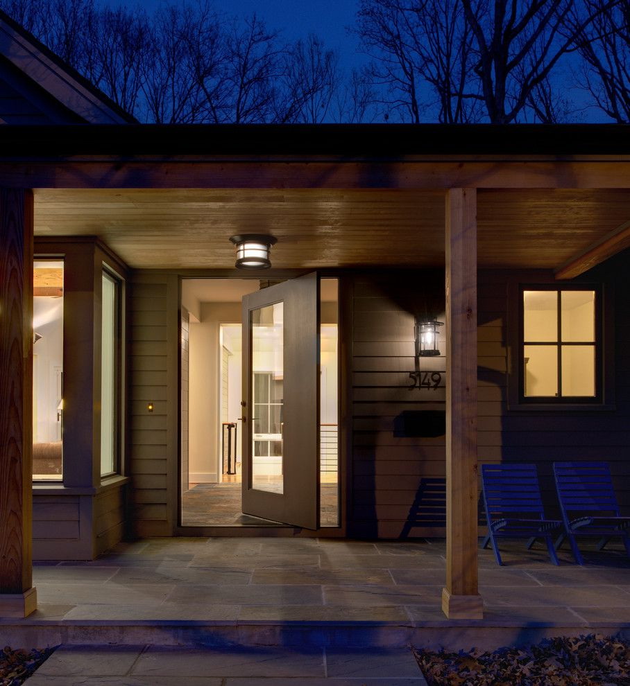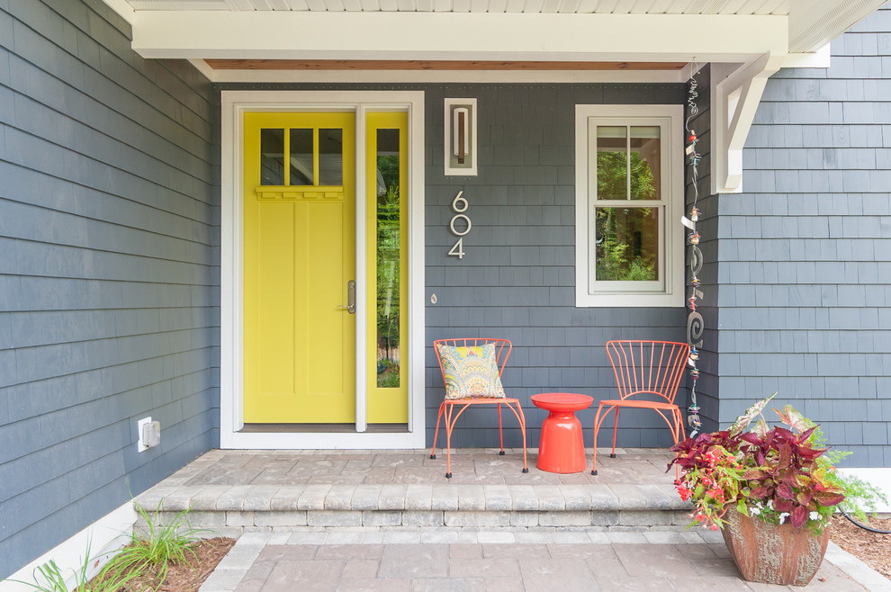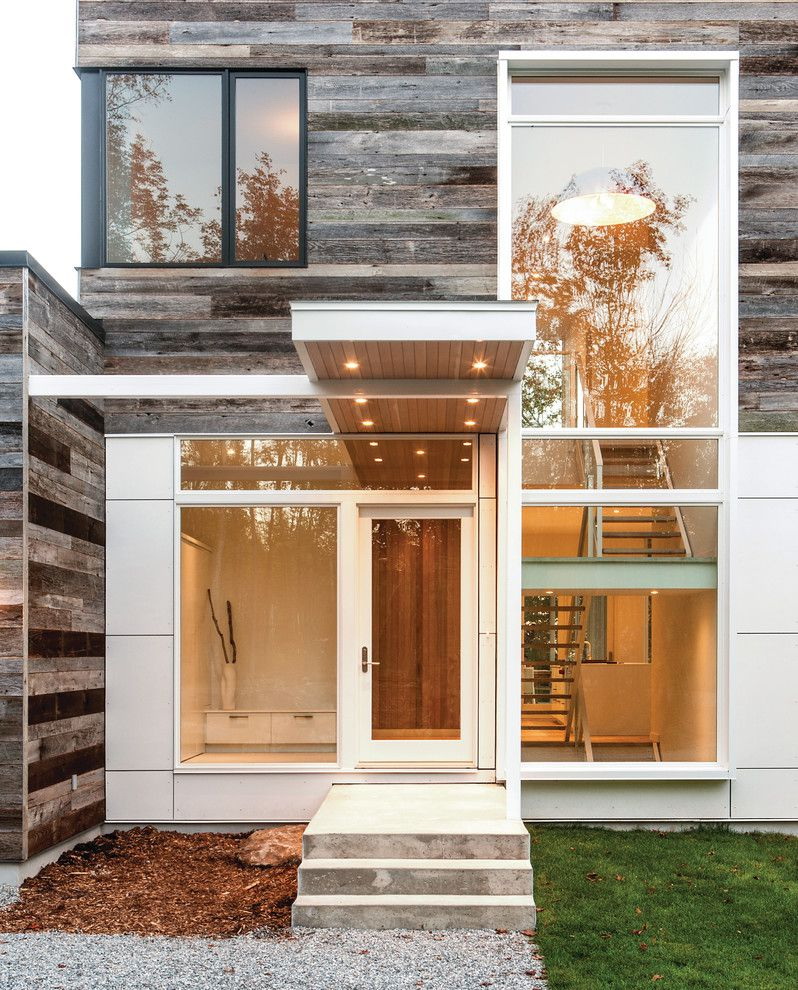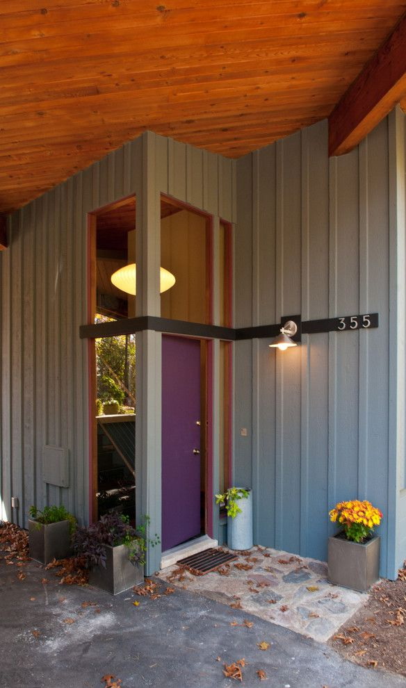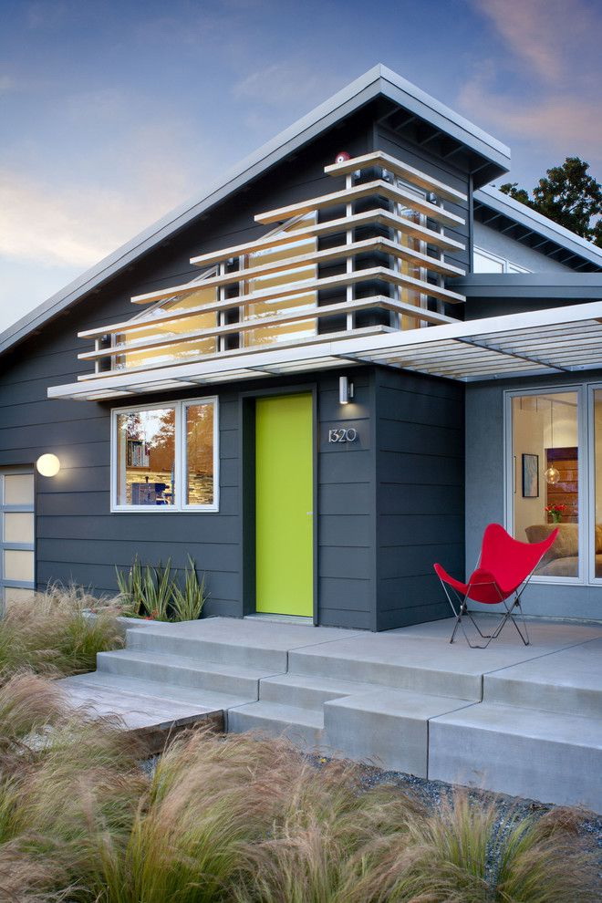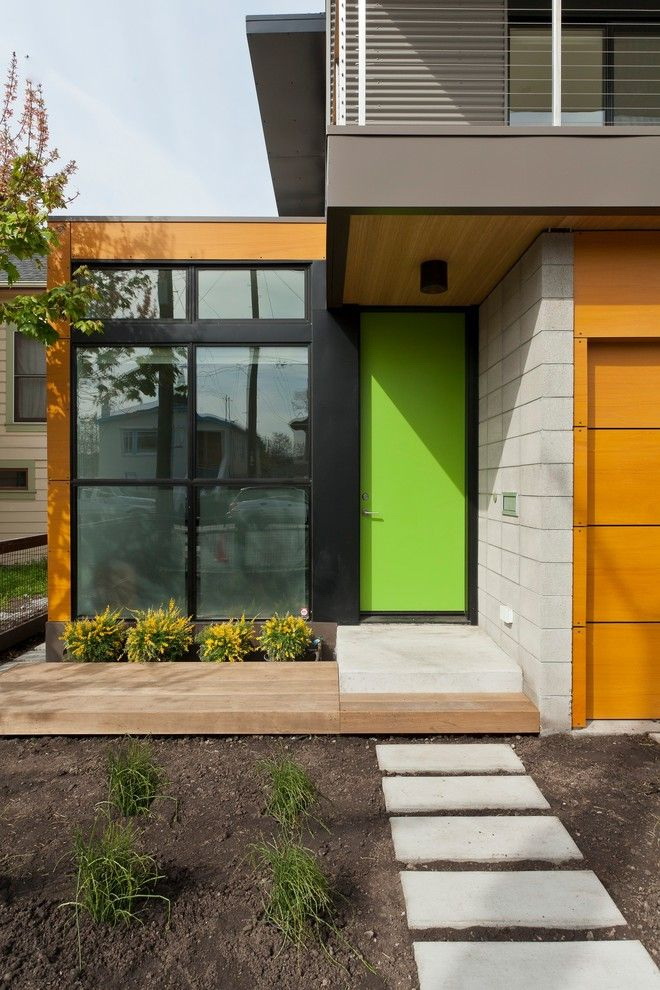 Normalmente, a porta é feita para se ajustar ao resto do estilo - as mesmas linhas das janelas, um tom da mesma cor das paredes. Mas às vezes você pode fazer um contraste, se você tem algo para combinar (por exemplo, com um telhado).