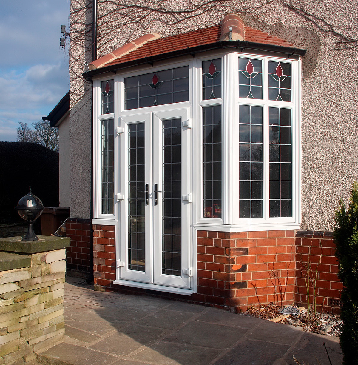 - Vitral. O método mais comum de acabamento. Pequenos pedaços de vidro são inseridos em uma moldura especial, formando um desenho ou padrão. A luz que passa por ele é colorida, o que também parece interessante e bonito. O único inconveniente é a fragilidade. Vitrais facilmente quebrados, voam para fora, se deterioram.