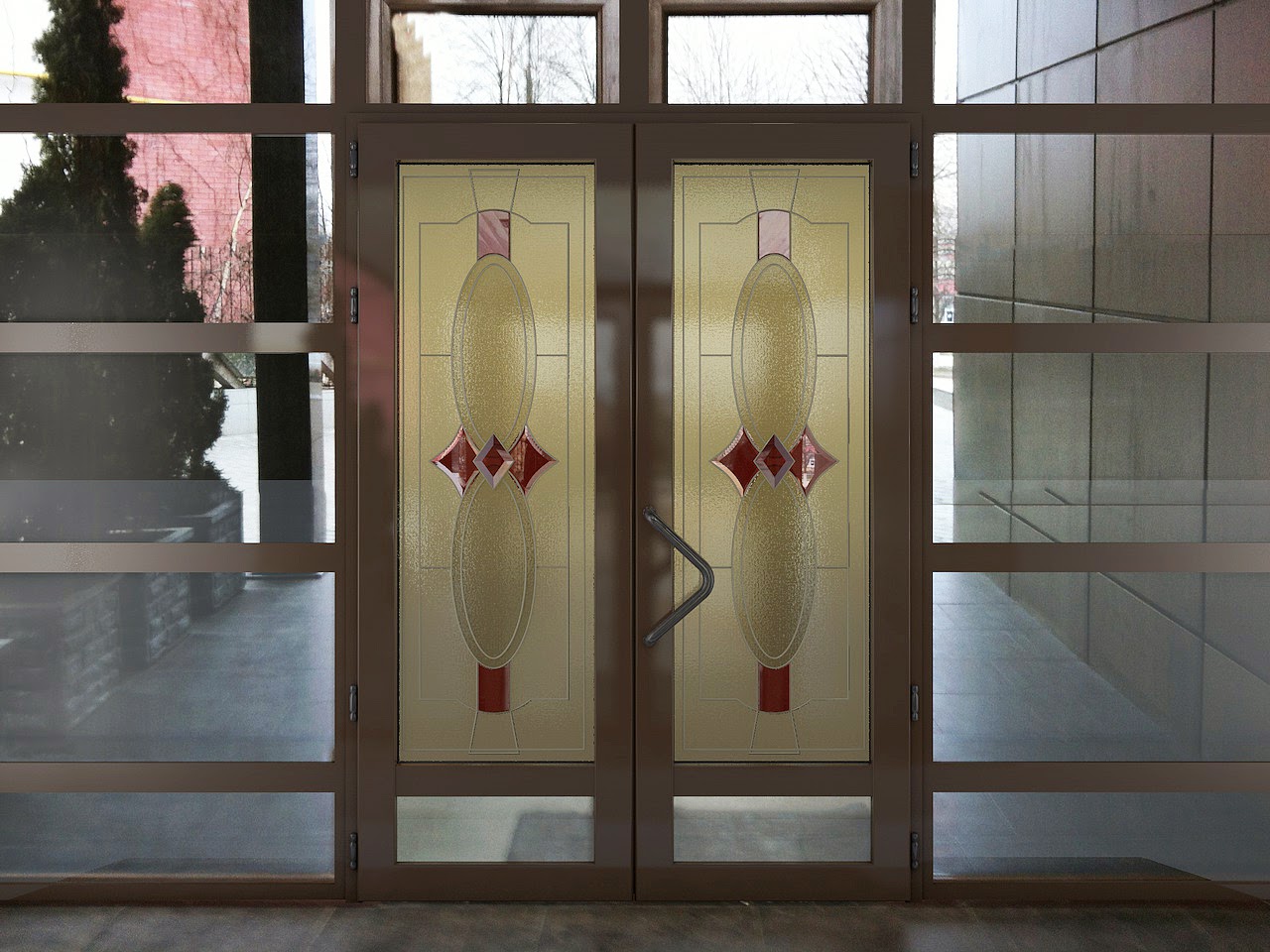 - Cor. O vidro multicolorido, mesmo que não seja um vitral, ainda parece ser bom. Se você olhar através dele, o mundo inteiro muda de cor. Além disso, permite contrastar a porta escolhendo o plástico de uma cor e o vidro de outra.