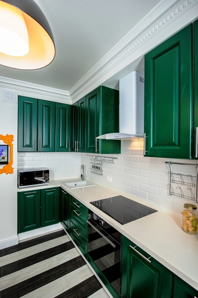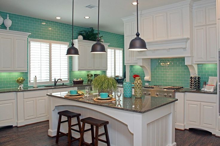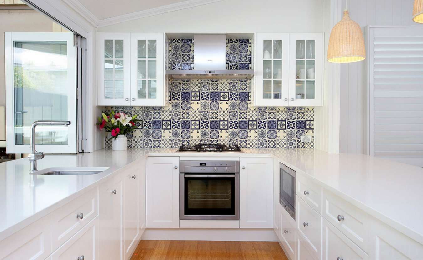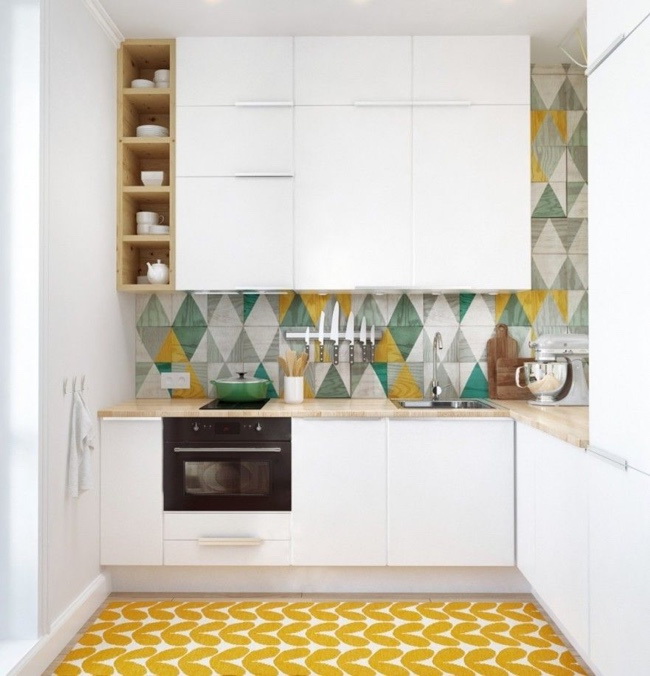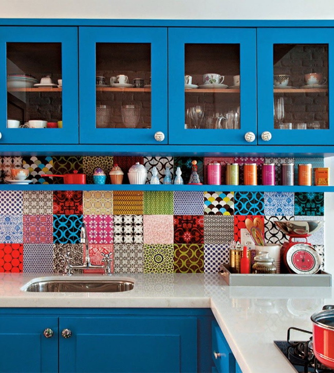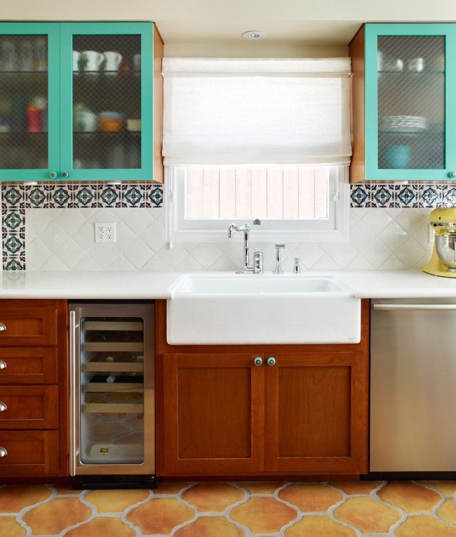 - As telhas de cores vivas são melhor usadas no projeto de um grande espaço de cozinha, para pequenas cozinhas, os designers recomendam usar um design de avental em tons pastel suaves.
