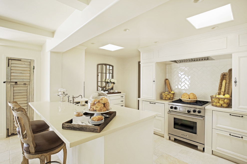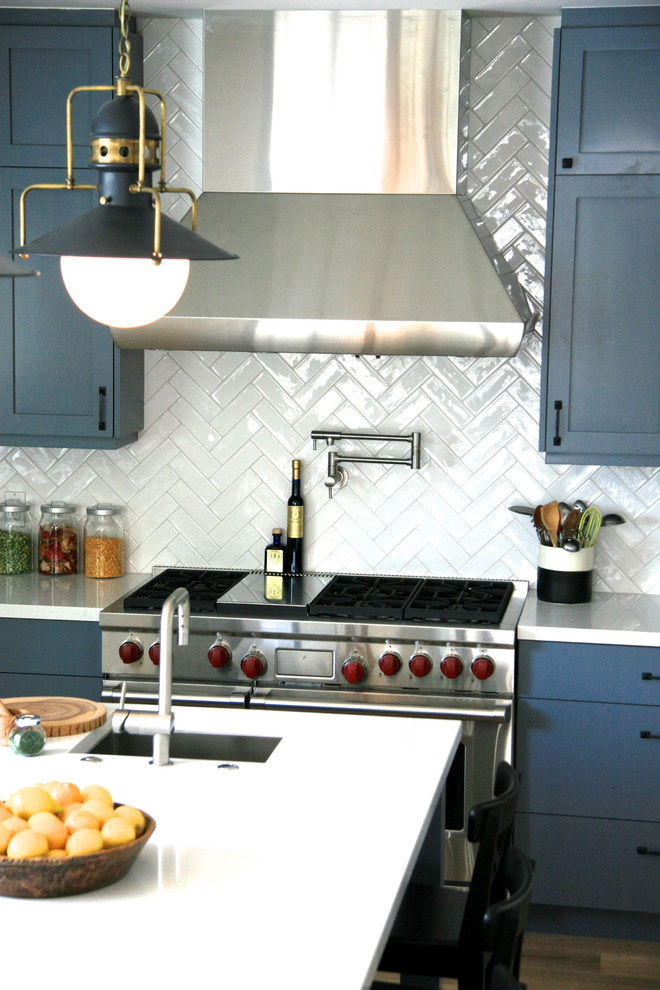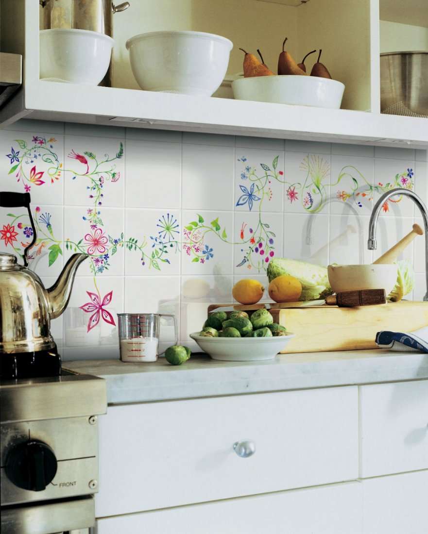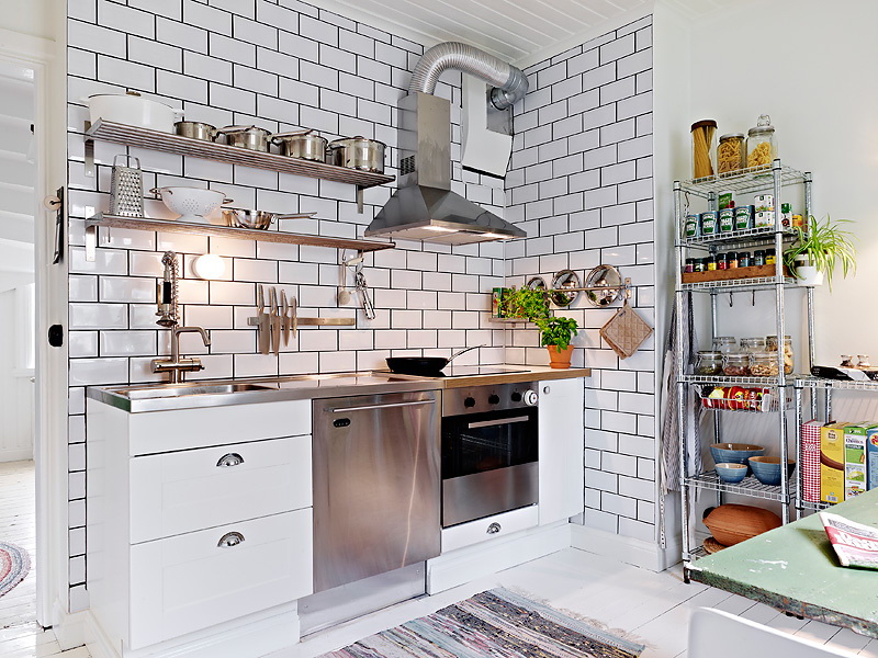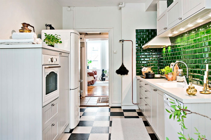 - As telhas de cores vivas são melhor usadas no projeto de um grande espaço de cozinha, para pequenas cozinhas, os designers recomendam usar um design de avental em tons pastel suaves.