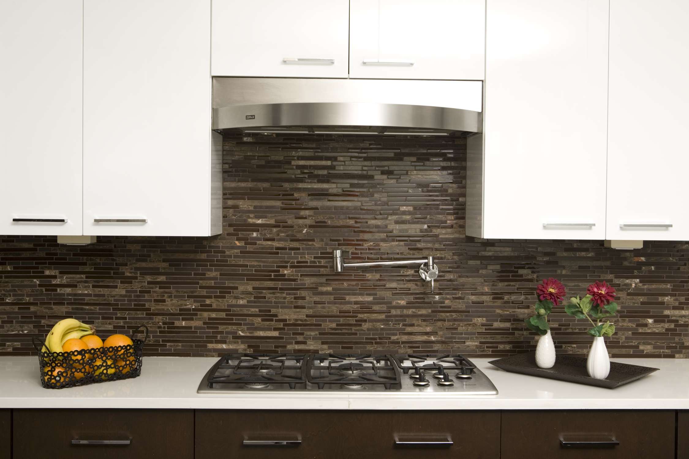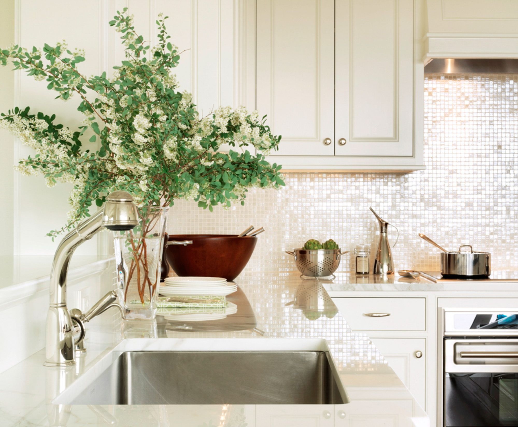 O brilho do espelho do avental se encaixa perfeitamente nos estilos de alta tecnologia ou moderno, enfatizando o brilho do mobiliário de móveis de cozinha.