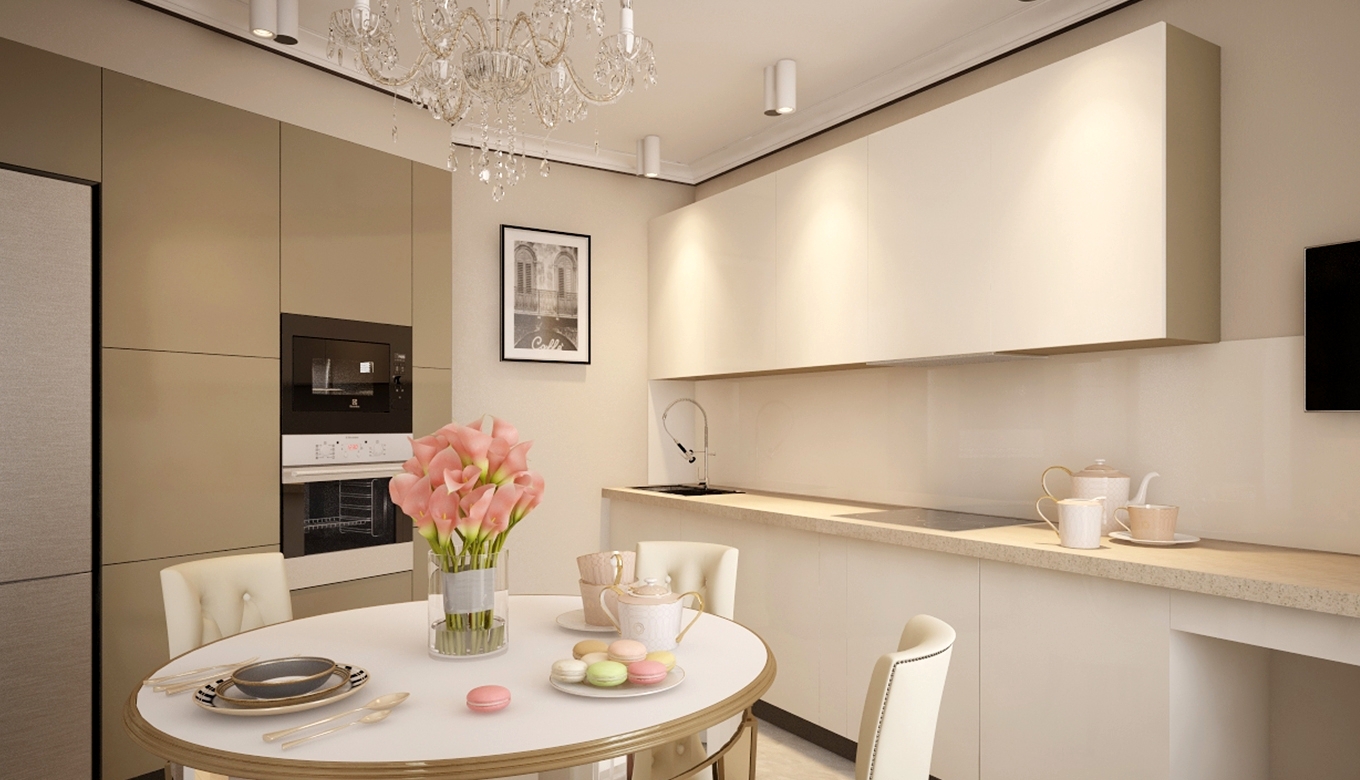 Uma tal luz no design da cozinha ajudará a criar uma atmosfera familiar acolhedora. Claro, é melhor escolher pequenos equipamentos que serão montados perto do plano do teto. Eles podem ser um design simples, vai enfatizar a praticidade do candelabro e facilitar o cuidado dele.