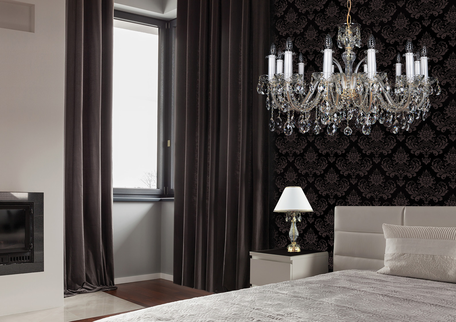 Uma luminária que criará o máximo de conforto é adequada para o quarto e pode ser combinada até mesmo em estilos como o de alta tecnologia, moderno e com mobília simples e funcional. A escolha leva em conta a altura da sala, a cor das paredes e toda a mobília, o tamanho da cama.. Para esta sala é melhor escolher um lustre de cristal com uma função para regular a intensidade da luz.