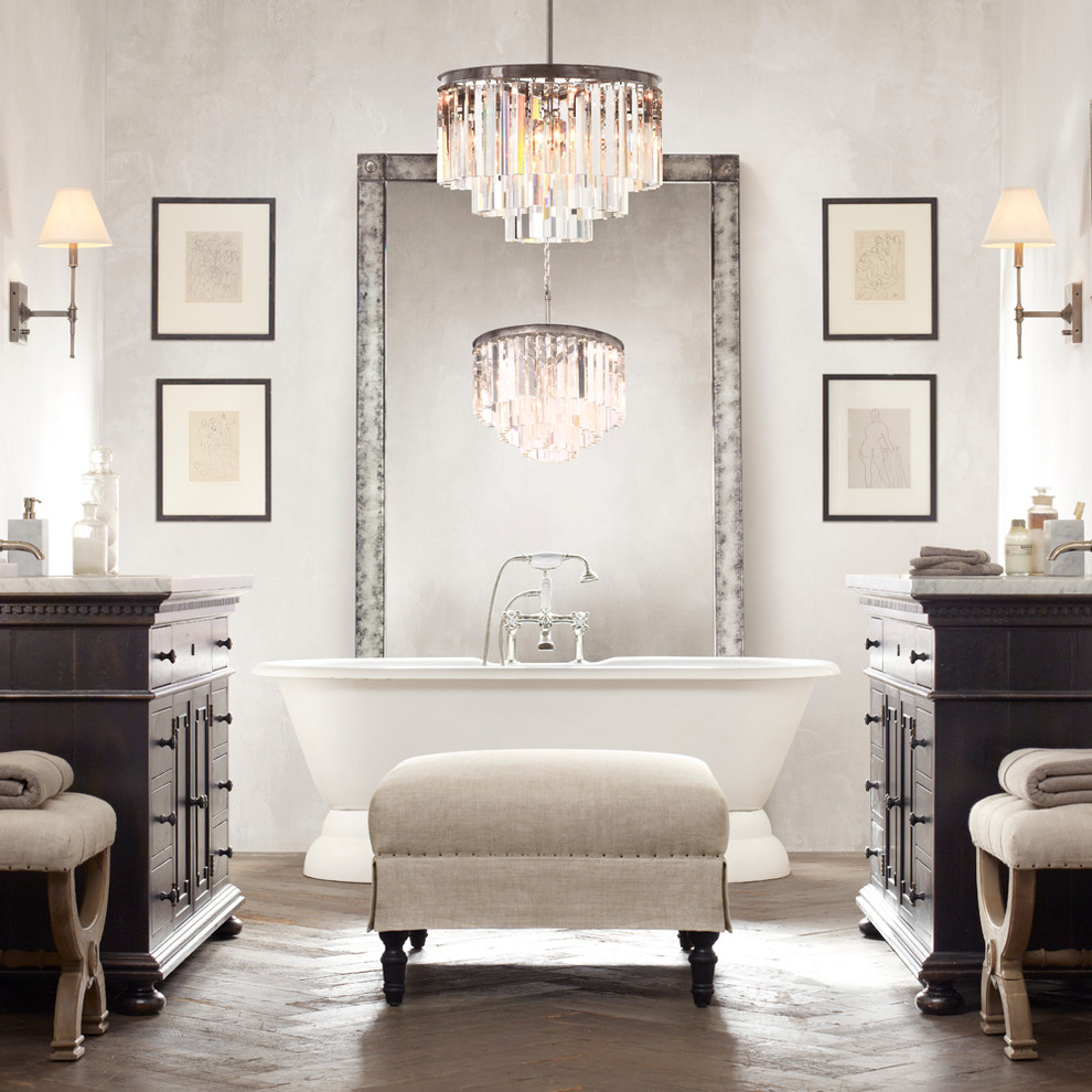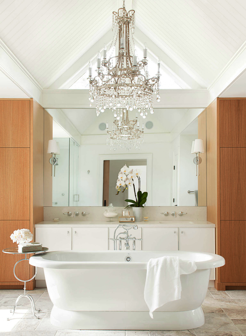 A umidade do cristal não é terrível, portanto, essas lâmpadas podem ser colocadas com segurança no banheiro. Para este quarto, encaixe o dispositivo de iluminação no estilo arte deco. Iluminação no banheiro deve ser não só parte da decoração, mas também prática. Com a ajuda de um candelabro, você pode brincar com a luz e a decoração da sala.