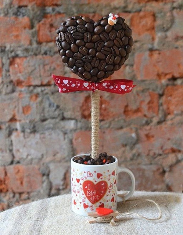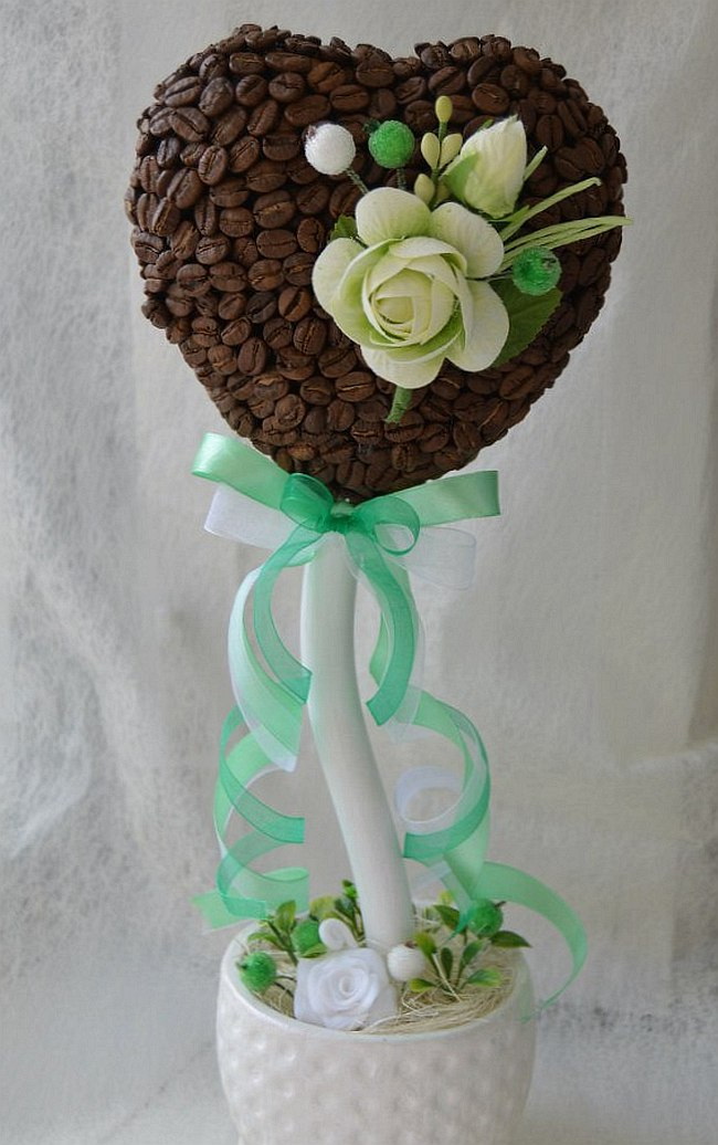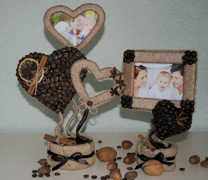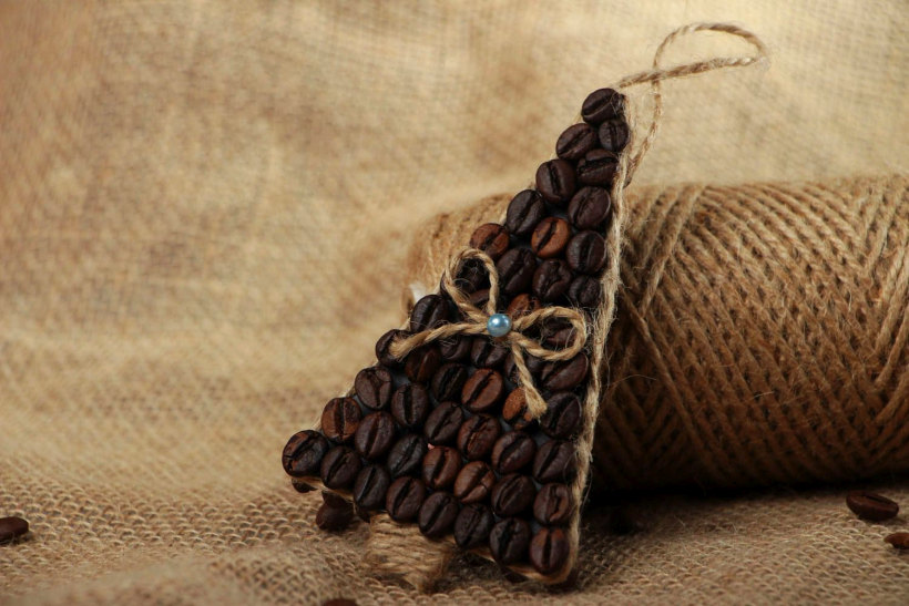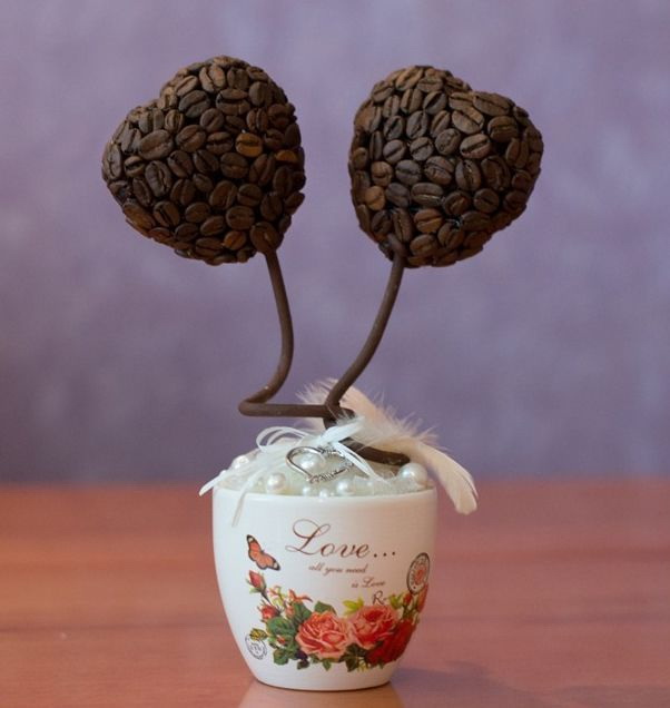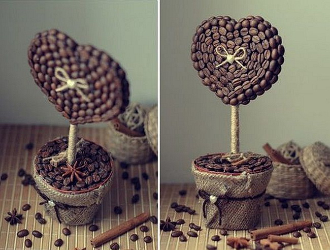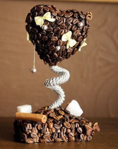 Este tipo de artesanato é mais adequado para adultos, porque entre eles há também um amador para fazer algo com as próprias mãos. Uma característica distintiva de tais lembranças - o aroma que vem dos grãos de café, é armazenado por um longo tempo. O artesanato será uma ótima idéia para um amante de café, você pode fazer isso por si mesmo.