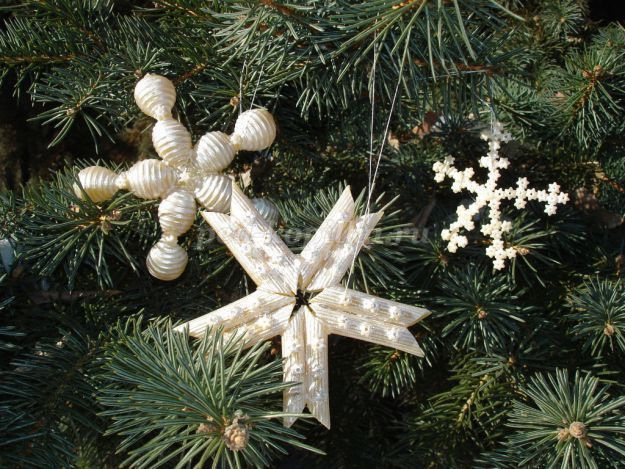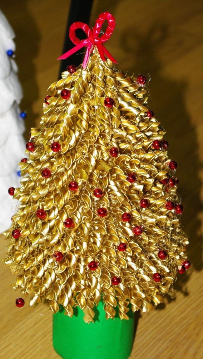 - Nós decoramos a árvore de Natal, como não é real, então os brinquedos devem ser especiais. Você pode usar outro macarrão patinador, arcos, conchas, espirais, pintado em cores diferentes com guache. Também é possível decorar a árvore de Natal com qualquer enfeite de Natal, chuva, e para estes fins, sobra de jóias, o que não será útil em qualquer lugar.