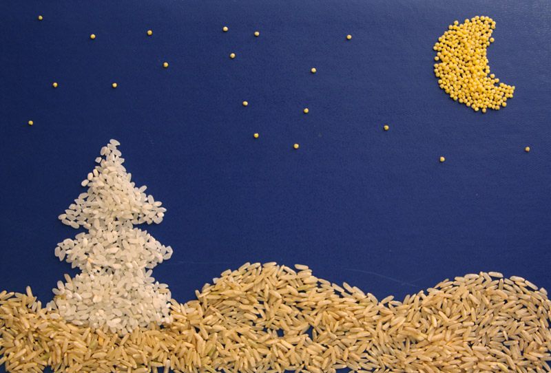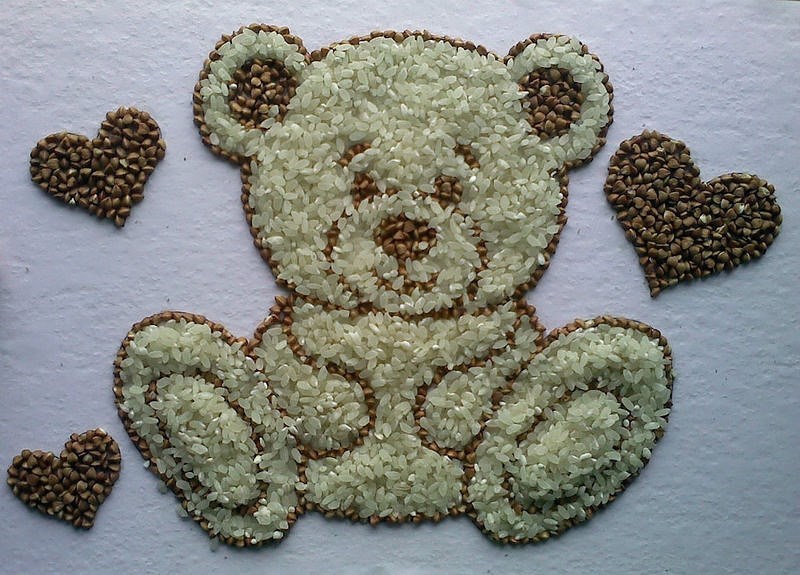 Usando um cereal será chato, então depois de ter uma idéia para um desenho, você precisa escolher diferentes opções. Você pode pintar o material selecionado em cores diferentes, alguns como pintar semolina. Você também precisa preparar uma superfície plana, pode ser parte de da mesa ou uma bandeja, um prato, outra panela plana.