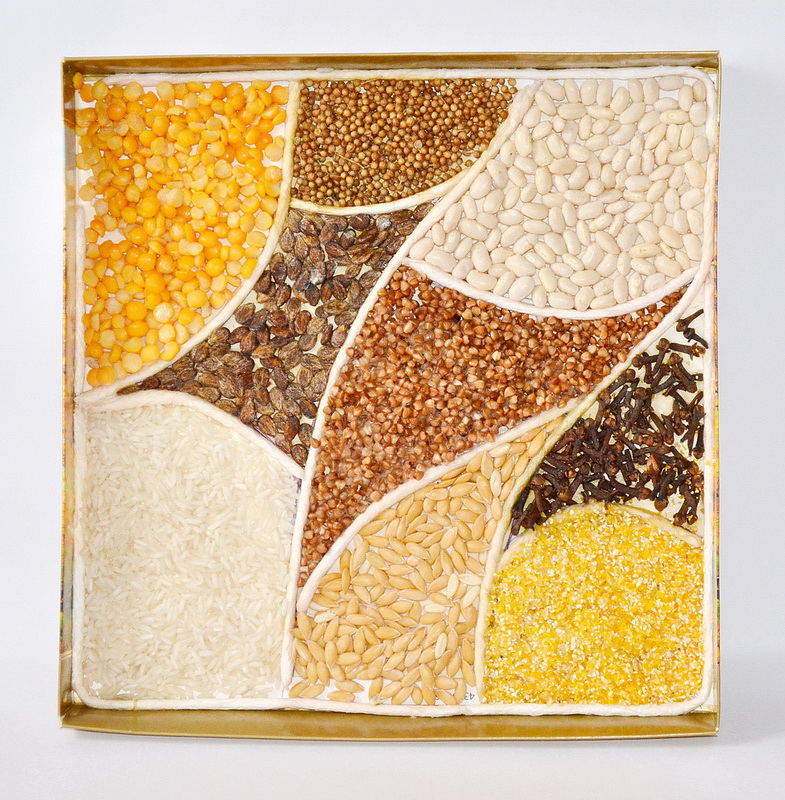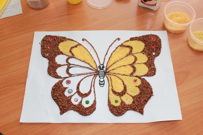 Tais ofícios são realizados com o mesmo princípio que simplesmente a partir de cereais. Para começar, um modelo é selecionado, então o pai determina quais partes do desenho serão feitas com cereais e quais massas. Depois, com a ajuda de cola e um pincel, primeiro grandes e pequenos detalhes são pintados alternadamente, o material preparado é colado.