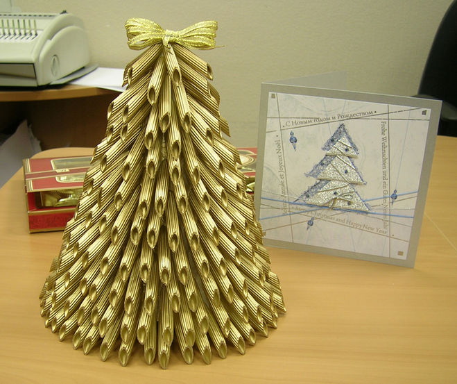 Existem várias opções para fazer uma árvore de massas. Simples, mas ao mesmo tempo linda, está no papelão ou em qualquer densa papel. O produto é realizado em várias etapas: