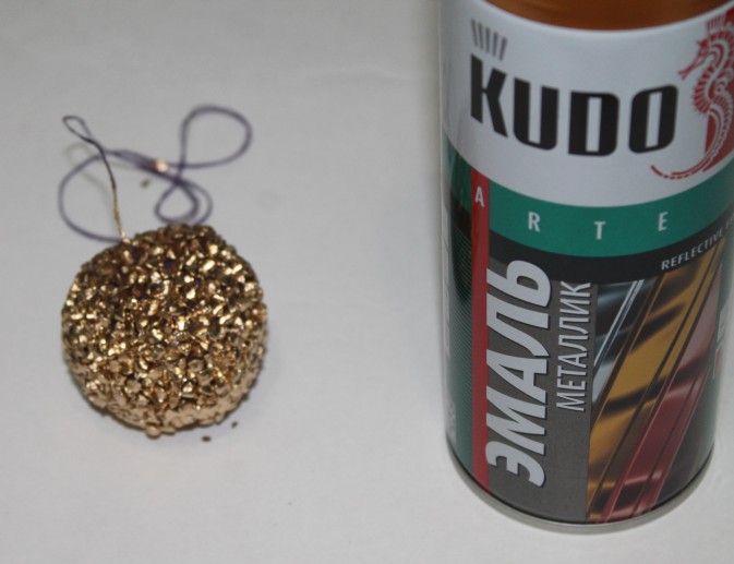 - Tomamos spray de tinta, é desejável cor de ouro, injetamos um brinquedo, deixamos para secar.É aconselhável escolher a cor do spray de acordo com a cor do cereal usado, o ouro fica bem no trigo mourisco, prata no arroz e semolina.