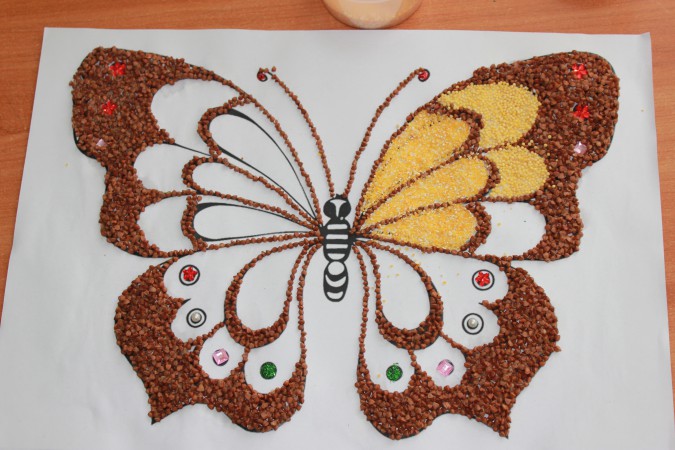 Vá para a parte principal. Manchamos uma parte do desenho com um pincel com cola, depois colocamos nessa área do grão, um a um. Se uma criança está em uma idade que pode usar uma pinça, é melhor usá-la.