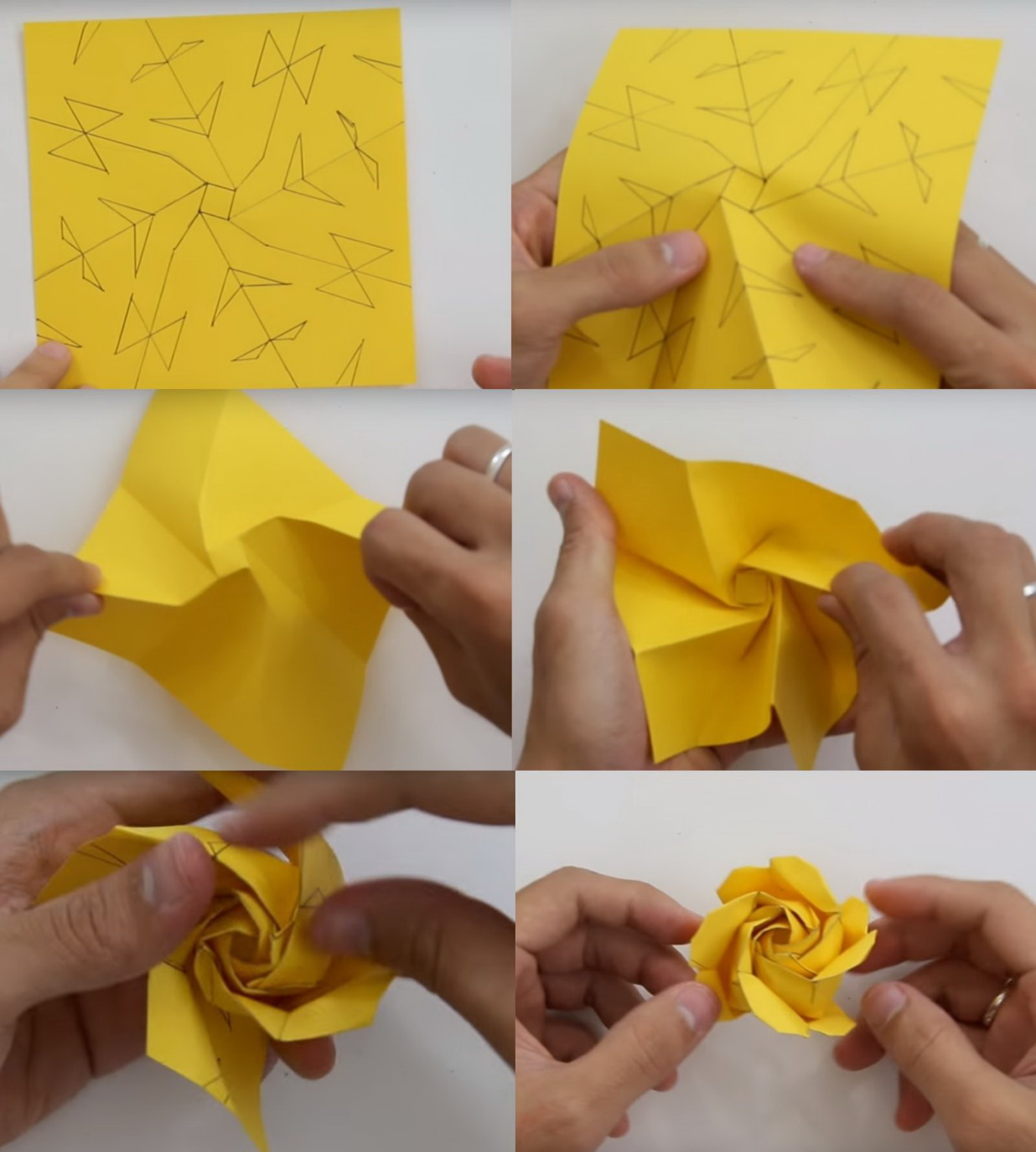 1. Desdobre o papel com as dobras necessárias, que servirão de guia para os próximos passos. Dobras formam o formulário "+" e "x". Observe que as dobras “x” vão no sentido oposto às linhas transversais.